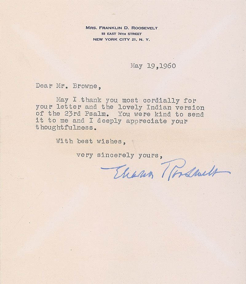 TLS, one page, 6 x 6.75, personal letterhead, May 19, 1960. Letter to an admirer. In part: “May I thank you most cordially for your letter and the lovely Indian version of the 23rd Psalm.” In fine condition.