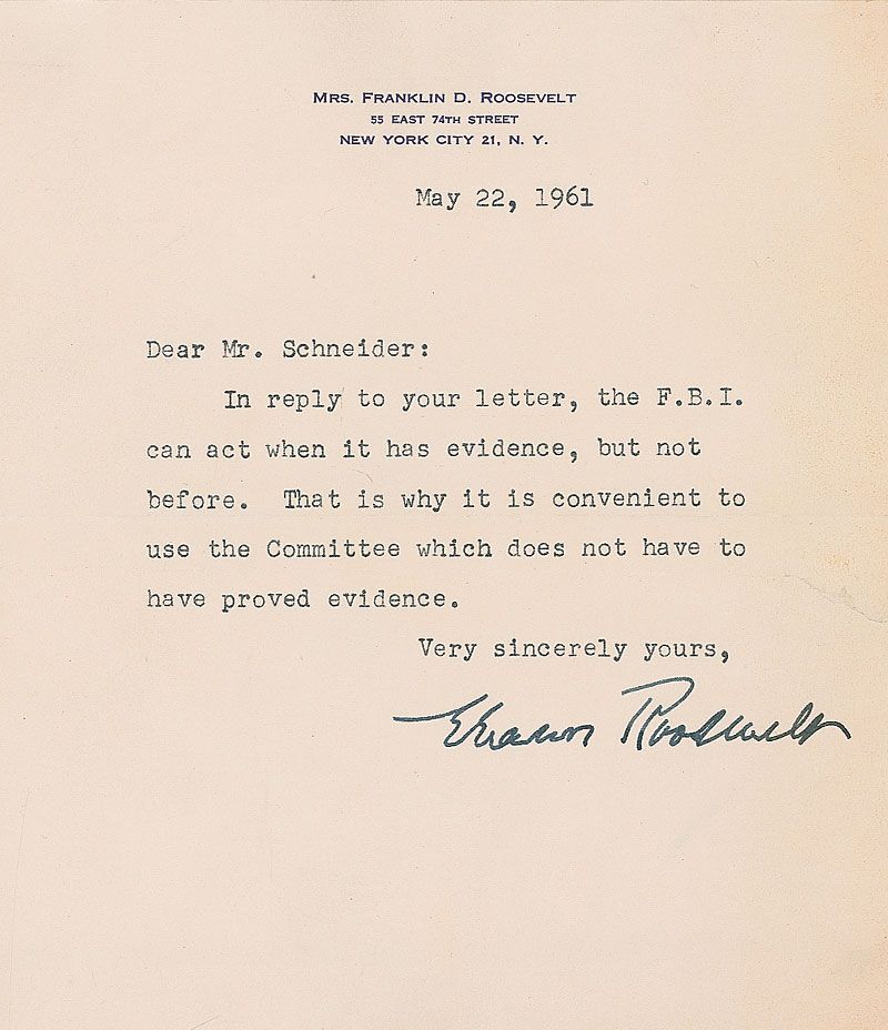 TLS, one page, 6 x 6.75, personal letterhead, May 22, 1961. Letter to Allan Schneider, a close advisor to Claire and Babe Ruth. In part: “The F.B.I. can act when it has evidence, but not before. That is why it is convenient to use the Committee which does not have to have proved evidence.” A crease to the upper left corner and small repaired tear to the right border, otherwise fine condition. Accompanied by the original mailing envelope, bearing a stamped free frank.
