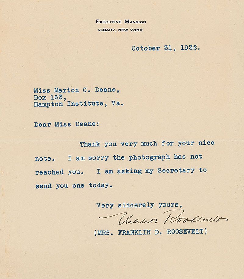 TLS, one page, 6 x 7, Executive Mansion letterhead, October 31, 1932. Short letter to a collector. In full: “Thank you very much for your nice note. I am sorry the photograph has not reached you. I am asking my Secretary to send you one today.” In fine condition.