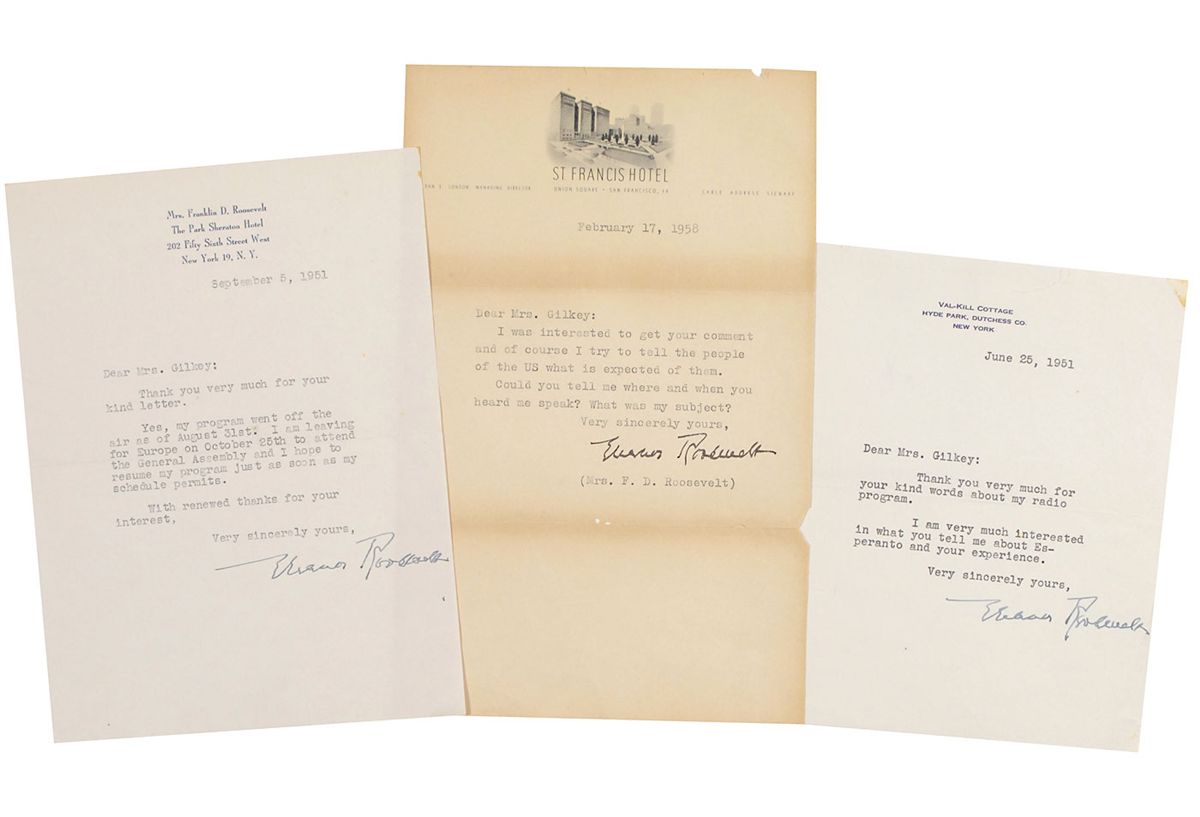 Three TLSs, each one page, various sizes and letterheads, two dated 1951 and one dated 1958, all to Mrs. Gilkey. One dated September 5, 1951 reads, in part: “Yes, my program went off the air as of August 31st. I am leaving for Europe on October 25th to attend the General Assembly and I hope to resume my program just as soon as my schedule permits.” In overall very good condition.
