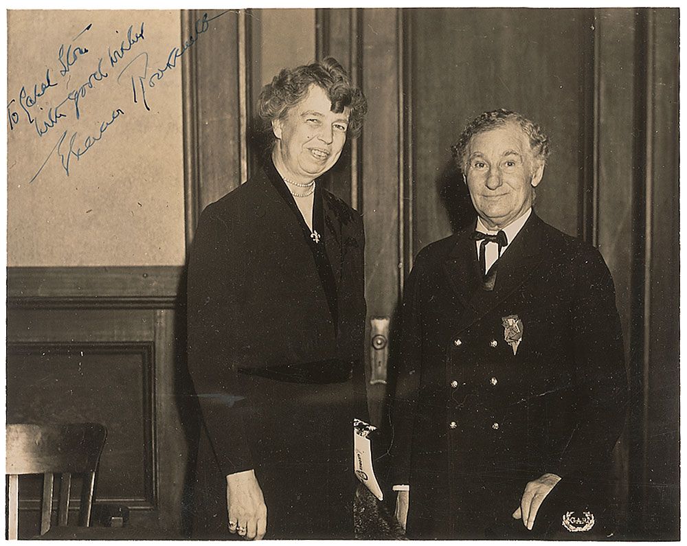 Uncommon vintage glossy 8 x 6.5 photo of Roosevelt at a formal event, signed and inscribed in fountain pen, “To Carol Stone, with good wishes, Eleanor Roosevelt.” Trimmed edges (slightly affecting first letter of inscription), and scattered bends and creases, otherwise fine condition.