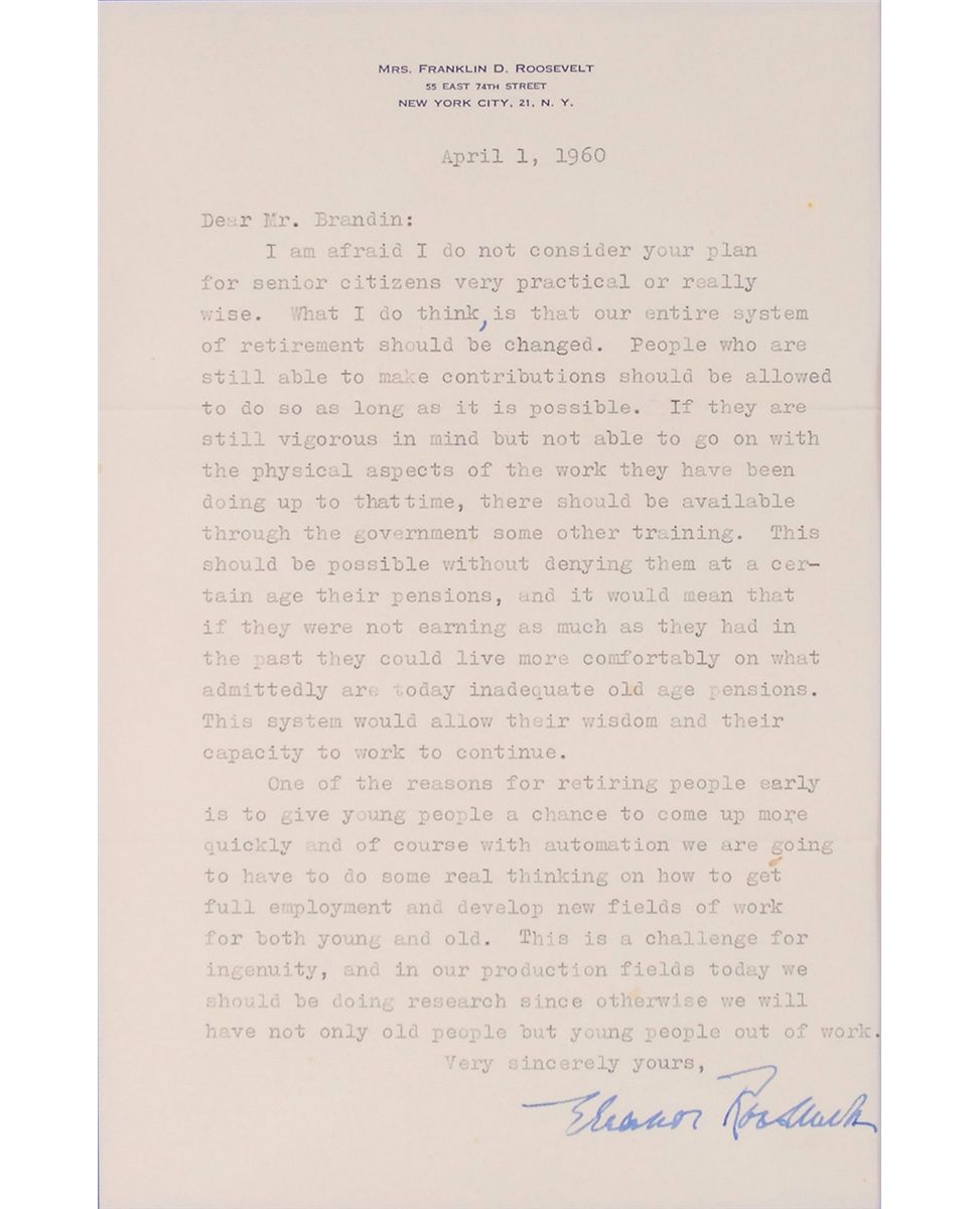 TLS, one page, 6.25 x 9.75, personal letterhead, April 1, 1960. Letter to Mr. Walter Brandin. In full: “I am afraid I do not consider your plan for senior citizens very practical or really wise. What I do think, is that our entire system of retirement should be changed. People who are still able to make contributions should be allowed to do so as long as it is possible. If they are still vigorous in mind but not able to go on with the physical aspects of the work they have been doing up to that time, there should be available through the government some other training. This should be possible without denying them at a certain age their pensions, and it would mean that if they were not earning as much as they had in the past they could live more comfortably on what admittedly are today inadequate old age pensions. This system would allow their wisdom and their capacity to work to continue. One of the reasons for retiring people early is to give young people a chance to come up more quickly and of course with automation we are going to have to do some real thinking on how to get full employment and develop new fields of work for both young and old. This is a challenge for ingenuity, and in our production fields today we should be doing research since otherwise we will have not only old people but young people out of work.” Nicely double-matted and framed with a portrait and the original mailing envelope (bearing a stamped free frank) to an overall size of 22 x 18.5. In fine condition. Unusually excellent content addressing a social problem that remains to this day, especially appropriate as it was during her husband’s first term that Social Security was established to aid Americans in their old age.
