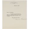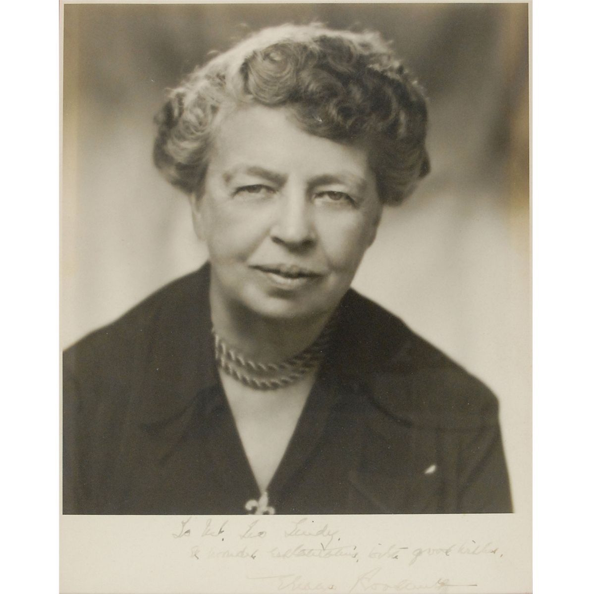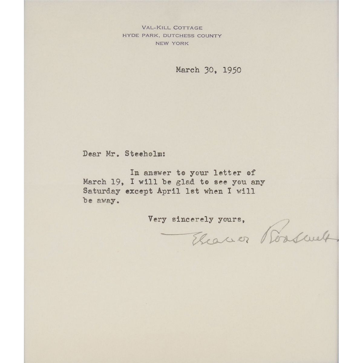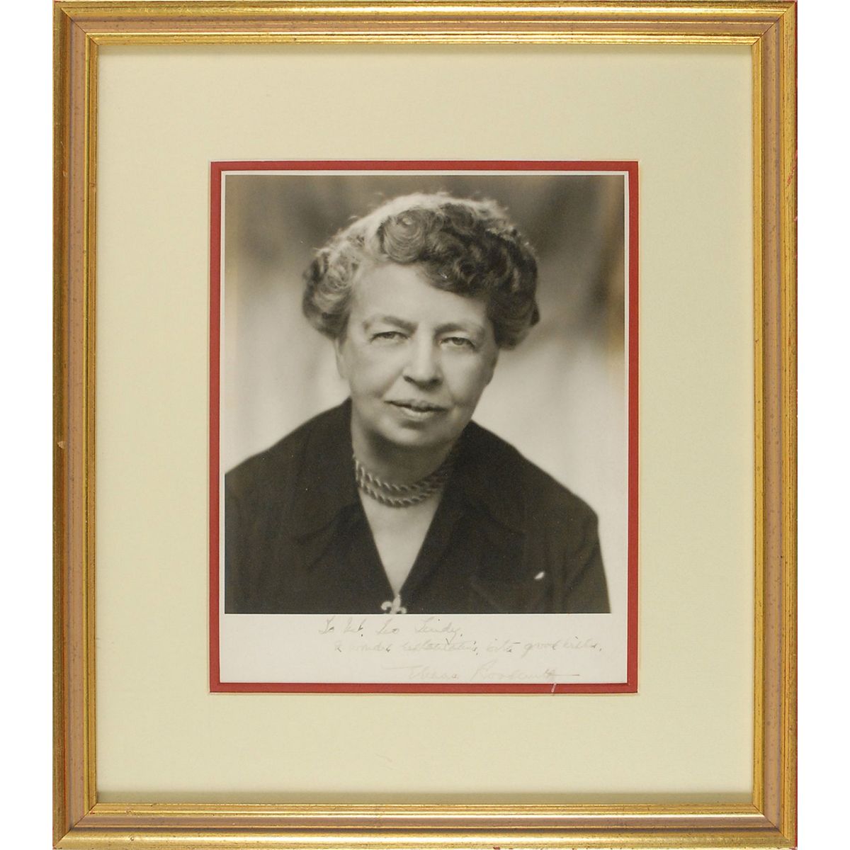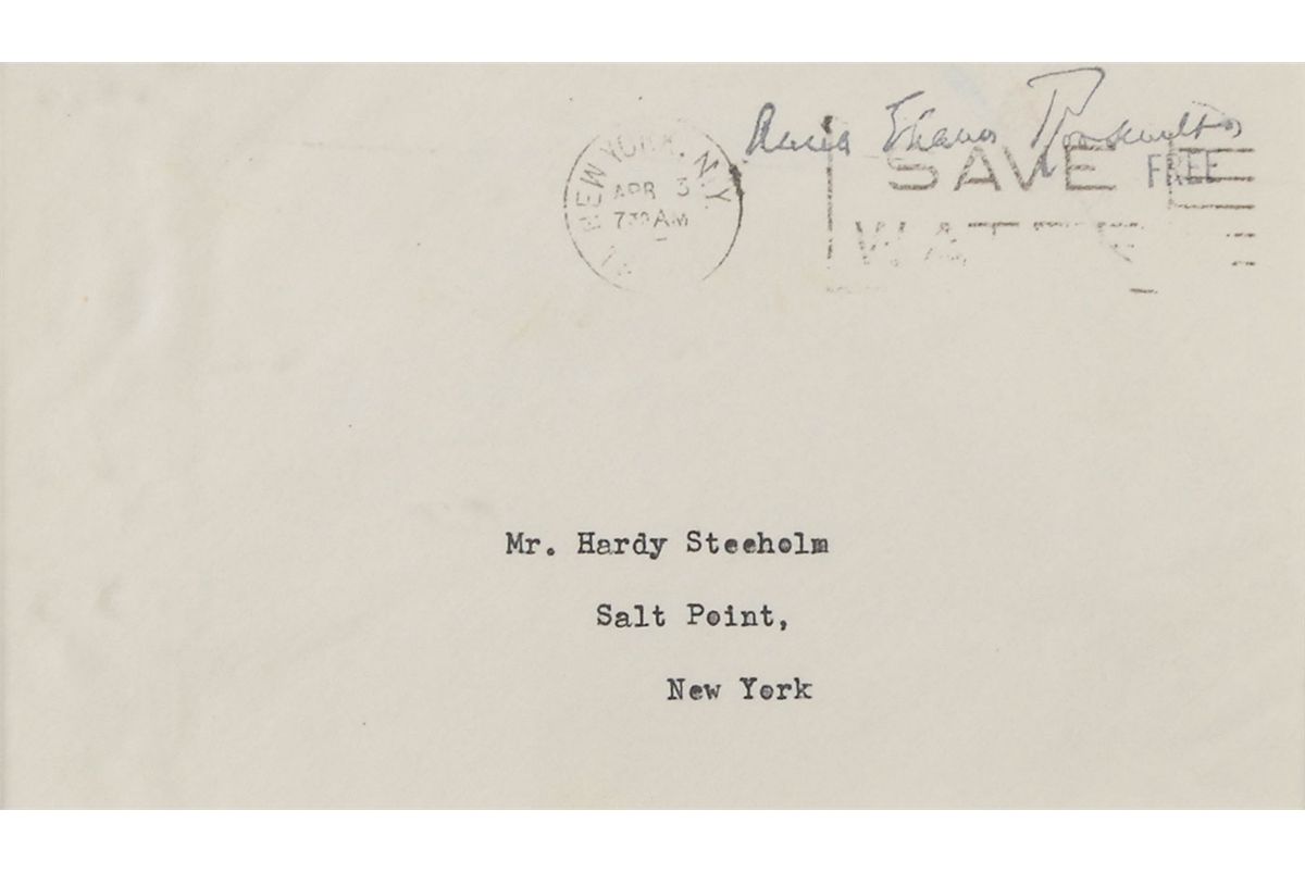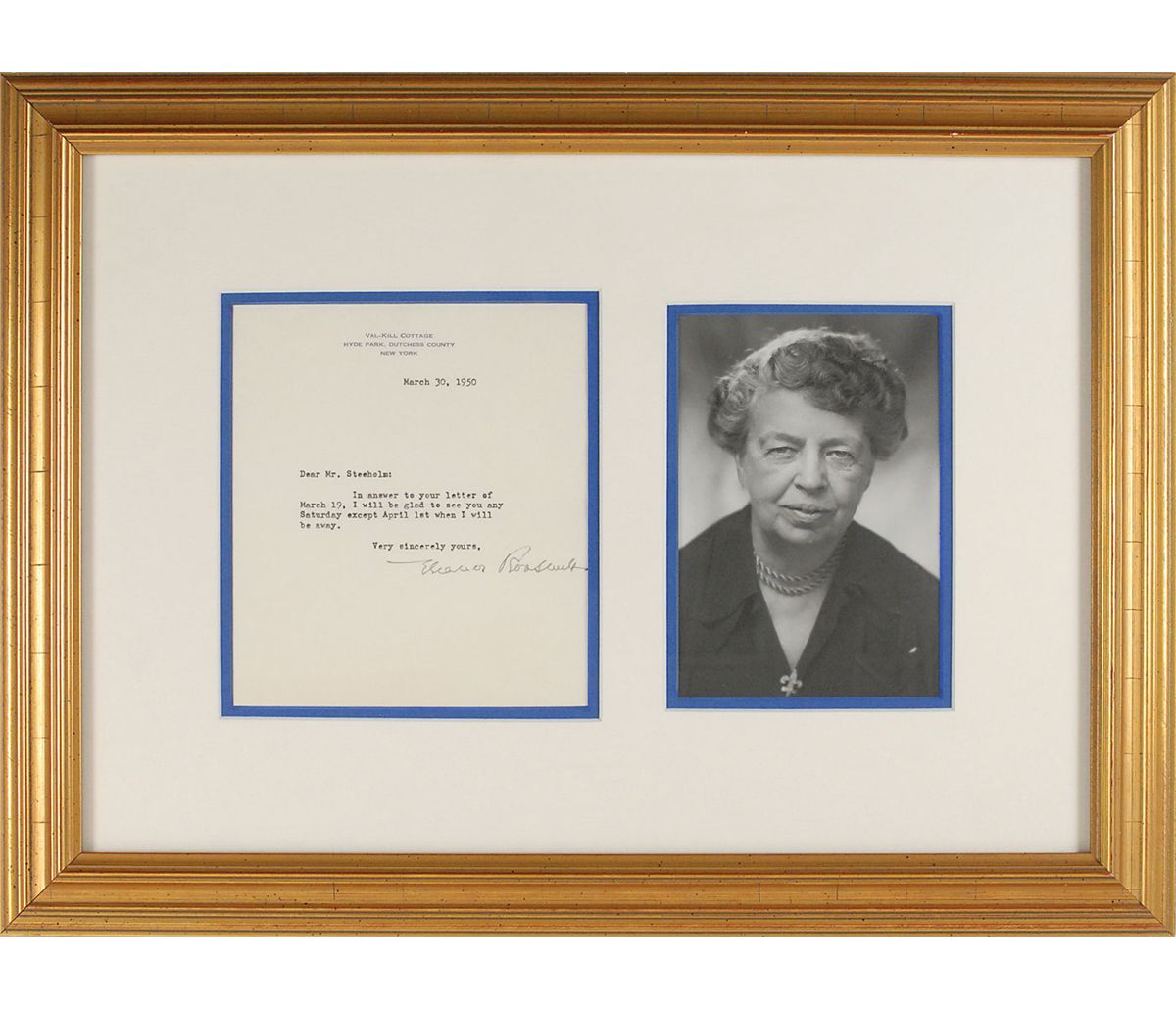 Two items: first, a matte-finish 7.5 x 9.5 head-and-shoulders portrait of Roosevelt, signed and inscribed in the lower border in fountain pen to NYC restaurateur Leo Lindy. Tastefully double-matted and framed to an overall size of 13.75 x 15.75. Second, a TLS, one page, 5.5 x 6.5, Val-Kill Cottage letterhead, March 30, 1950. Letter to Hardy Steeholm. In full: “In answer to your letter of March 19, I will be glad to see you any Saturday except April 1st when I will be away.” Double-matted and framed with a portrait to an overall size of 19 x 14, with a window on the reverse for viewing of the original mailing envelope bearing a stamped free frank. In overall fine condition.