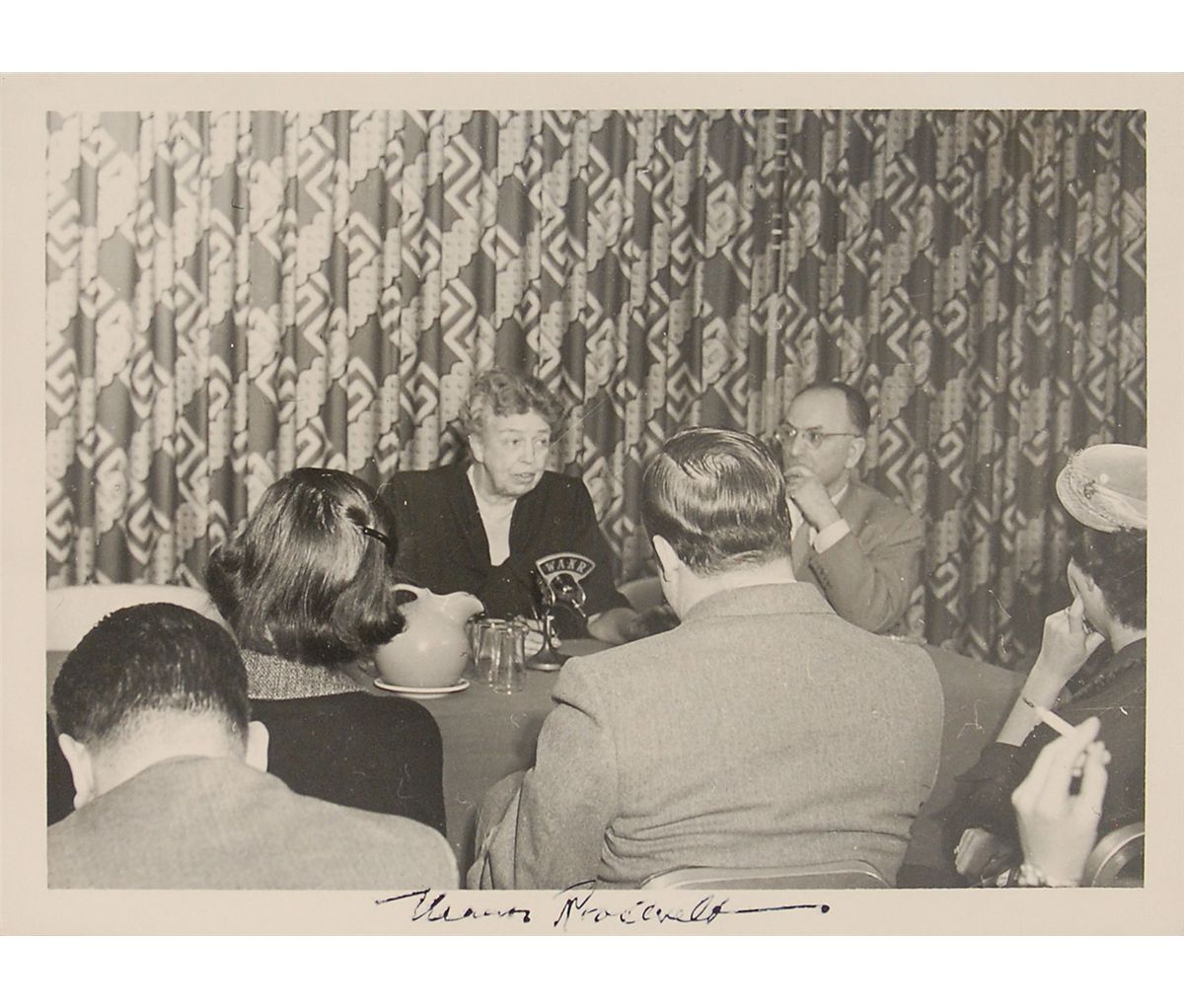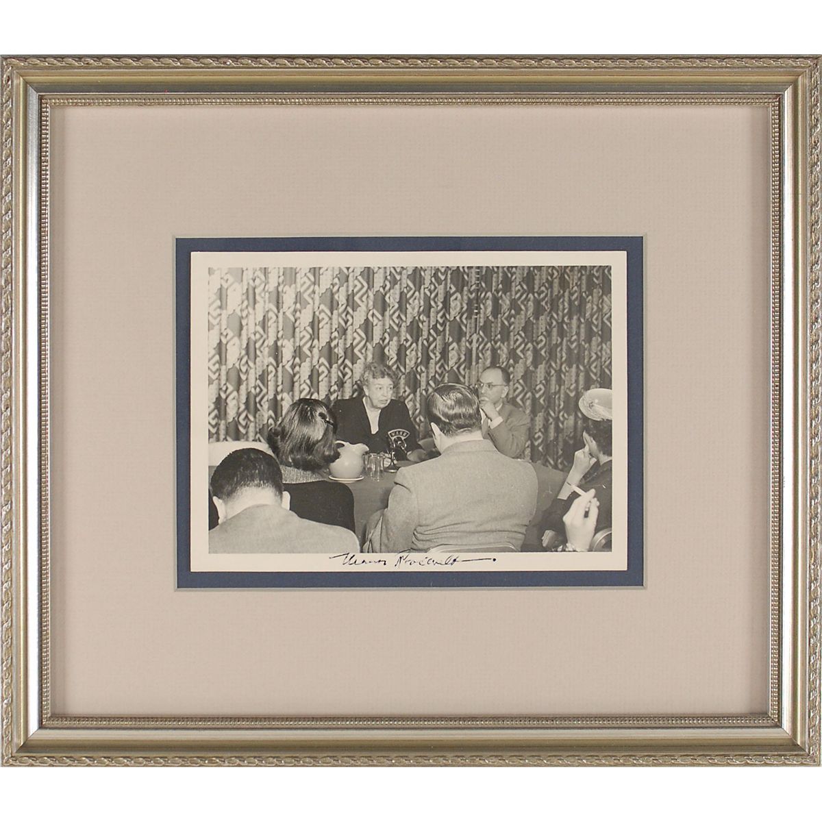 Glossy 7 x 5 photo of Roosevelt making a radio speech before a group of journalists, signed in the lower border in fountain pen. Matted and framed to an overall size of 13 x 11. In fine condition, with a bit of irregular adhesion to the signature.