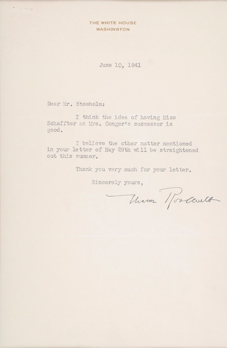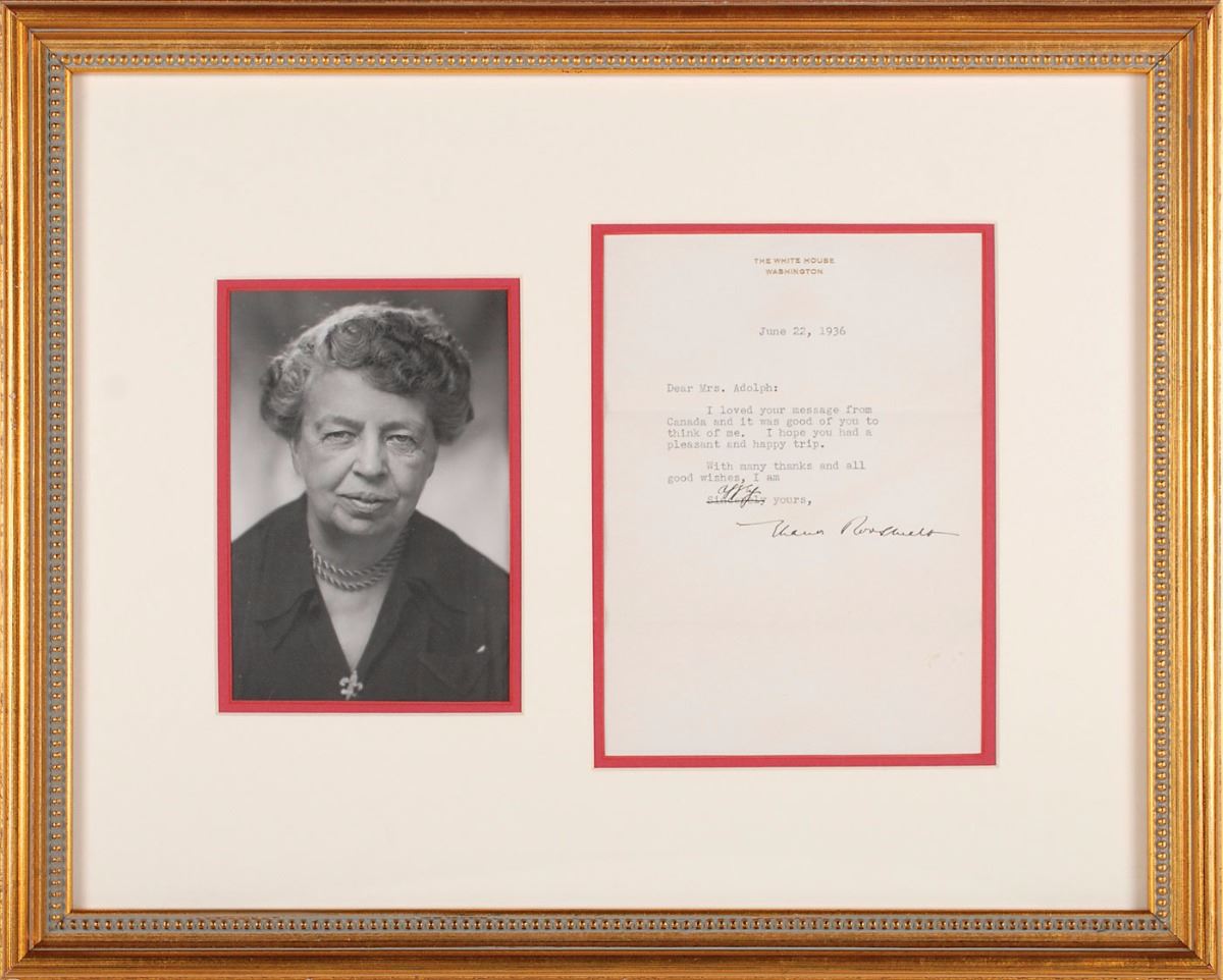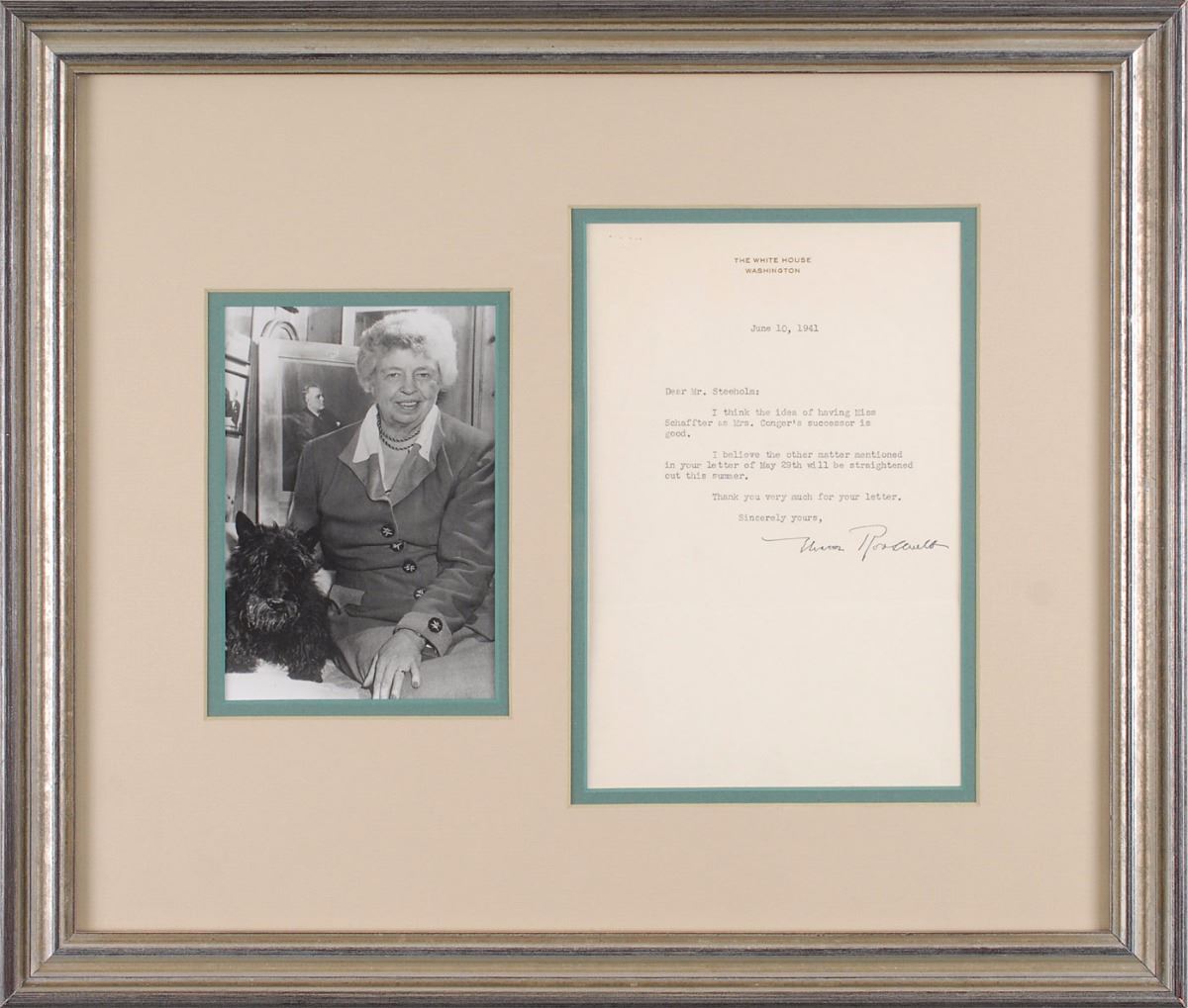 Three items: a glossy 7 x 5 photo of Roosevelt making a radio speech before a group of journalists, signed in the lower border in fountain pen, “Eleanor Roosevelt”; a TLS, White House letterhead, June 22, 1936, in full: “I loved your message from Canada and it was good of you to think of me. I hope you had a pleasant and happy trip”; and a TLS, White House letterhead, June 10, 1941, in full: “I think the idea of having Miss Schaffter as Mrs. Conger’s successor is good. I believe the other matter mentioned in your letter of May 29th will be straightened out this summer.” Roosevelt makes a handwritten emendation to the closing of the 1936 letter. In overall fine condition, with staple holes to the 1941 letter.