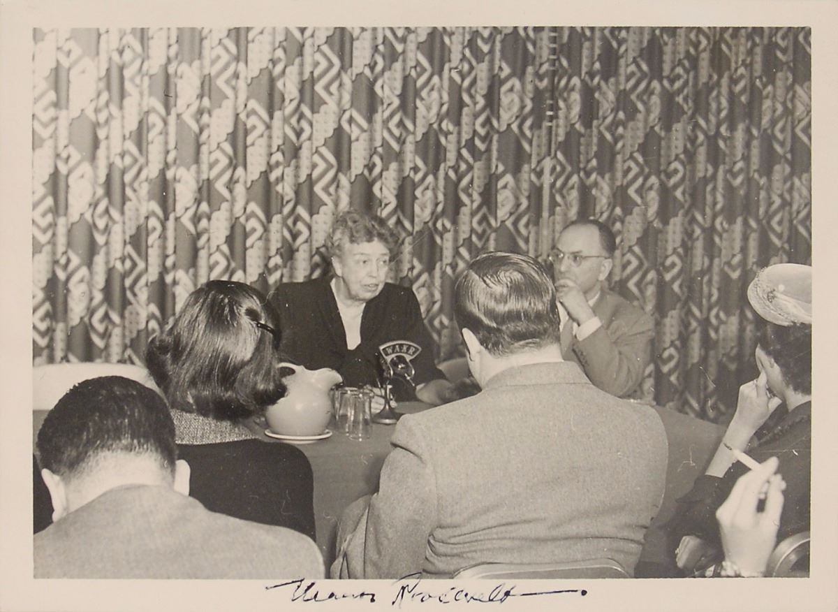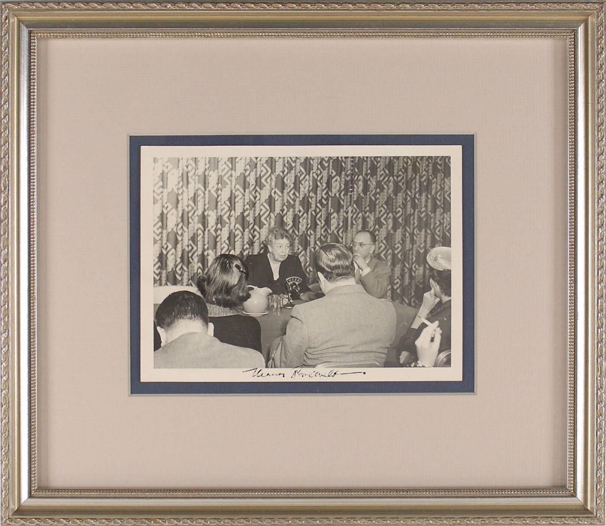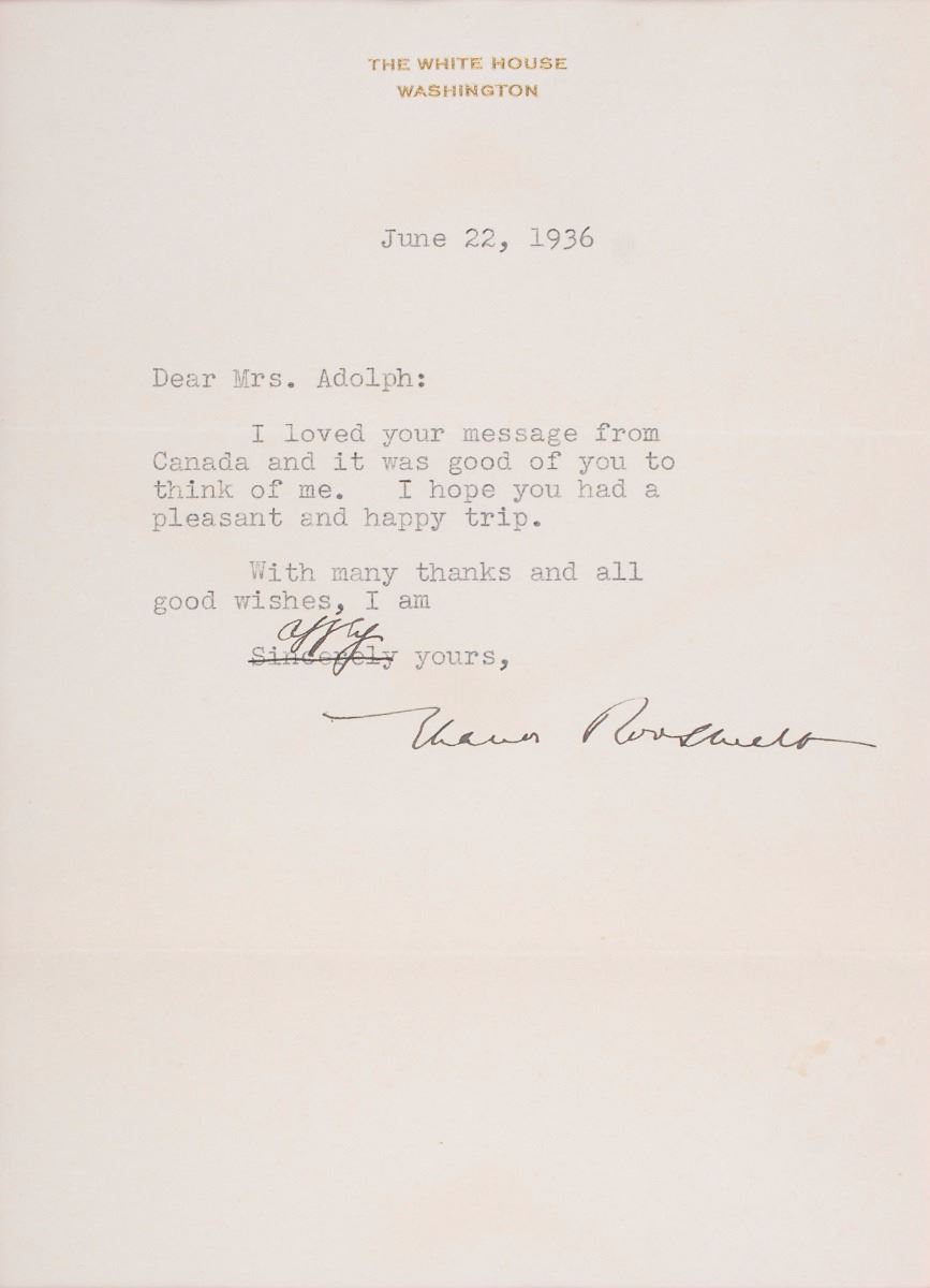 Three items: a glossy 7 x 5 photo of Roosevelt making a radio speech before a group of journalists, signed in the lower border in fountain pen, “Eleanor Roosevelt”; a TLS, White House letterhead, June 22, 1936, in full: “I loved your message from Canada and it was good of you to think of me. I hope you had a pleasant and happy trip”; and a TLS, White House letterhead, June 10, 1941, in full: “I think the idea of having Miss Schaffter as Mrs. Conger’s successor is good. I believe the other matter mentioned in your letter of May 29th will be straightened out this summer.” Roosevelt makes a handwritten emendation to the closing of the 1936 letter. In overall fine condition, with staple holes to the 1941 letter.