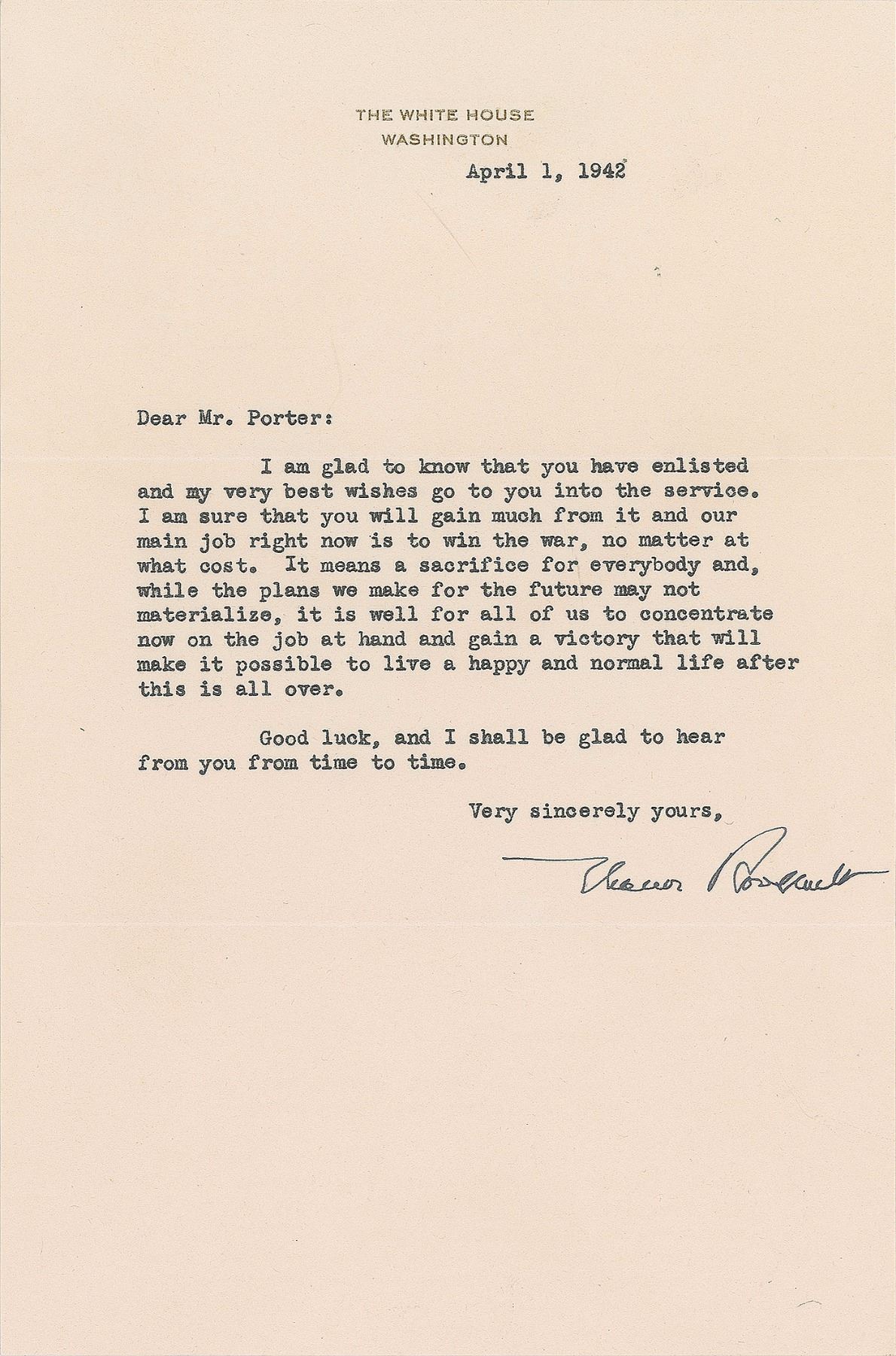 War-dated TLS, one page, 6 x 9.25, White House letterhead, April 1, 1942. Letter to Mr. Porter, in part: "I am glad to know that you have enlisted and my very best wishes go to you into the service. I am sure that you will gain much from it and our main job right now is to win the war, no matter at what cost. It means a sacrifice for everybody and, while the plans we make for the future may not materialize, it is well for all of us to concentrate now on the job at hand and gain a victory that will make it possible to lie a happy and normal life after this is all over." In fine condition.