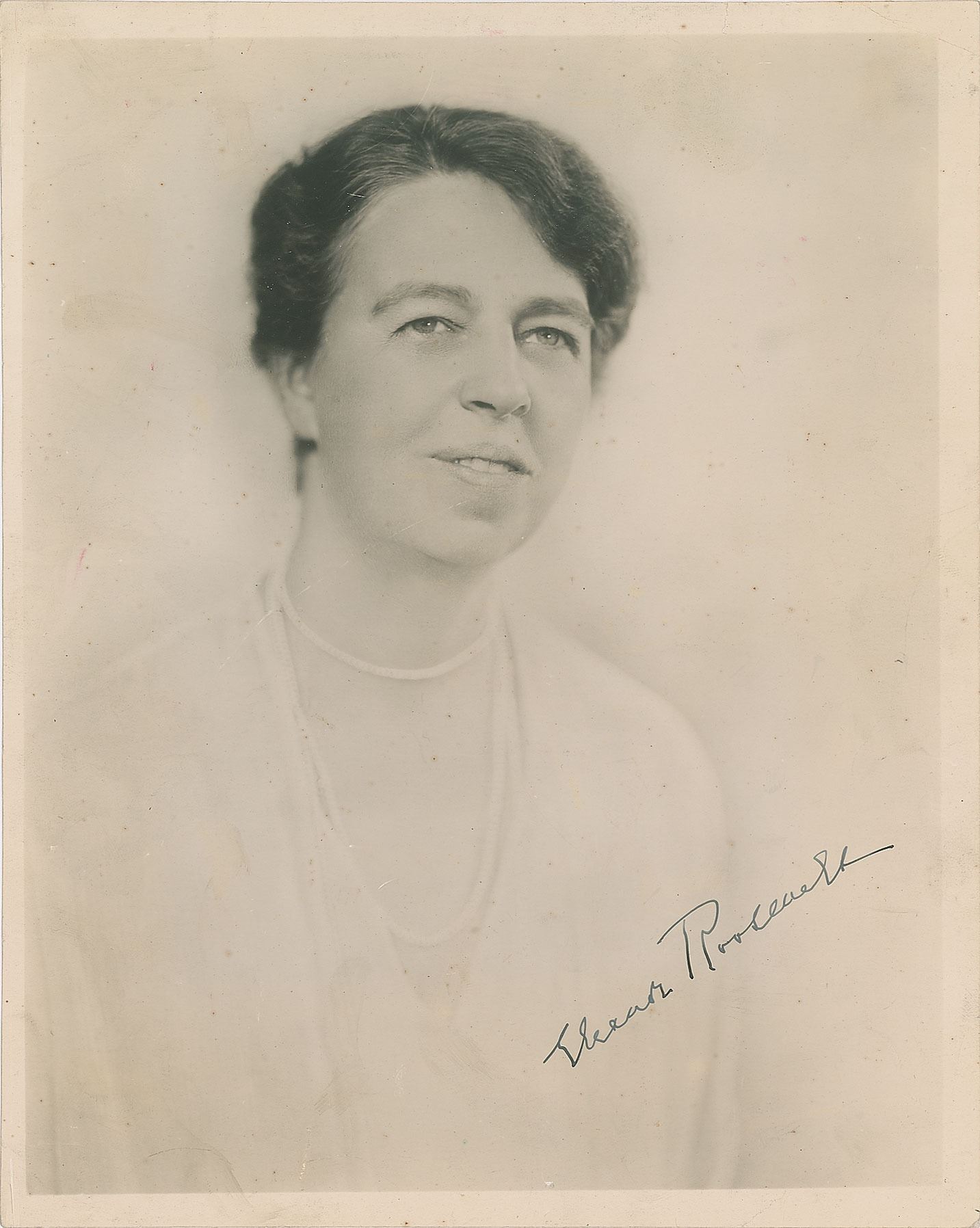 Very attractive vintage matte-finish 7.75 x 9.75 photo of Roosevelt wearing a light-colored dress against a similarly light background, making for a particularly ethereal pose, signed nicely in fountain pen. In very good to fine condition, with scattered light creasing, faint foxing, and a short tear to the lower border.