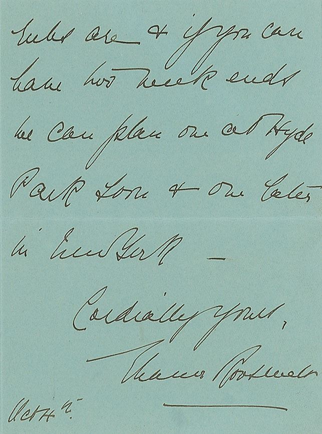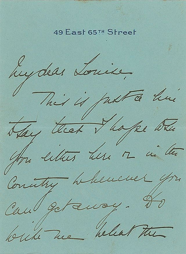 ALS, two pages on two adjoining sheets, 4 x 5.5, October 4, no year. Letter to "My dear Louise," in part: "This is just a line to say that I hope to see you either here or in the country whenever you can get away. Do write me…& if you can have two week ends we can plan one at Hyde Park…& one later in New York." In fine condition.