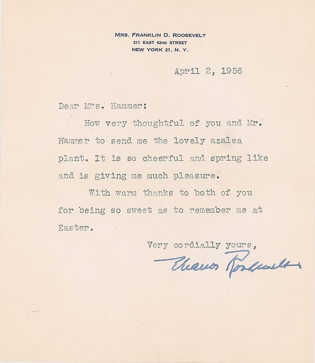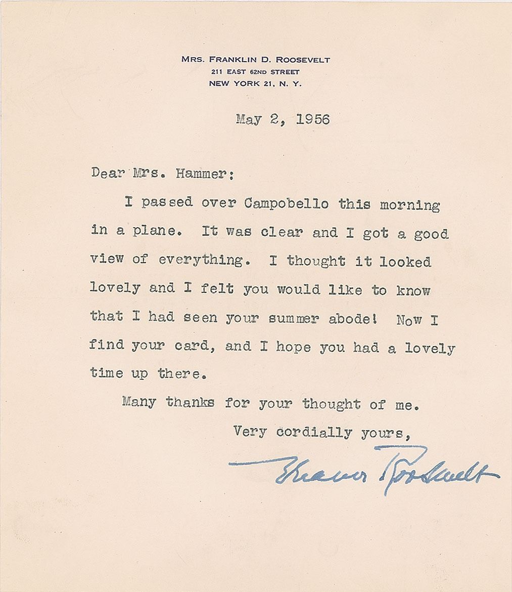 Two TLSs, each one page, 6 x 7, personal letterhead, April 2 and May 2, 1956, both to Mrs. Victor Hammer, the sister-in-law of industrialist Armand Hammer. The first, in part: "How very thoughtful of you and Mr. Hammer to send me the lovely azalea plant. It is so cheerful and spring like and is giving me much pleasure." The second, in part: "I passed over Campobello this morning in a plane. It was clear and I got a good view of everything. I thought it looked lovely and I felt you would like to know that I had seen your summer abode!" In overall fine condition. Accompanied by both original mailing envelopes, both bearing stamped free franks.