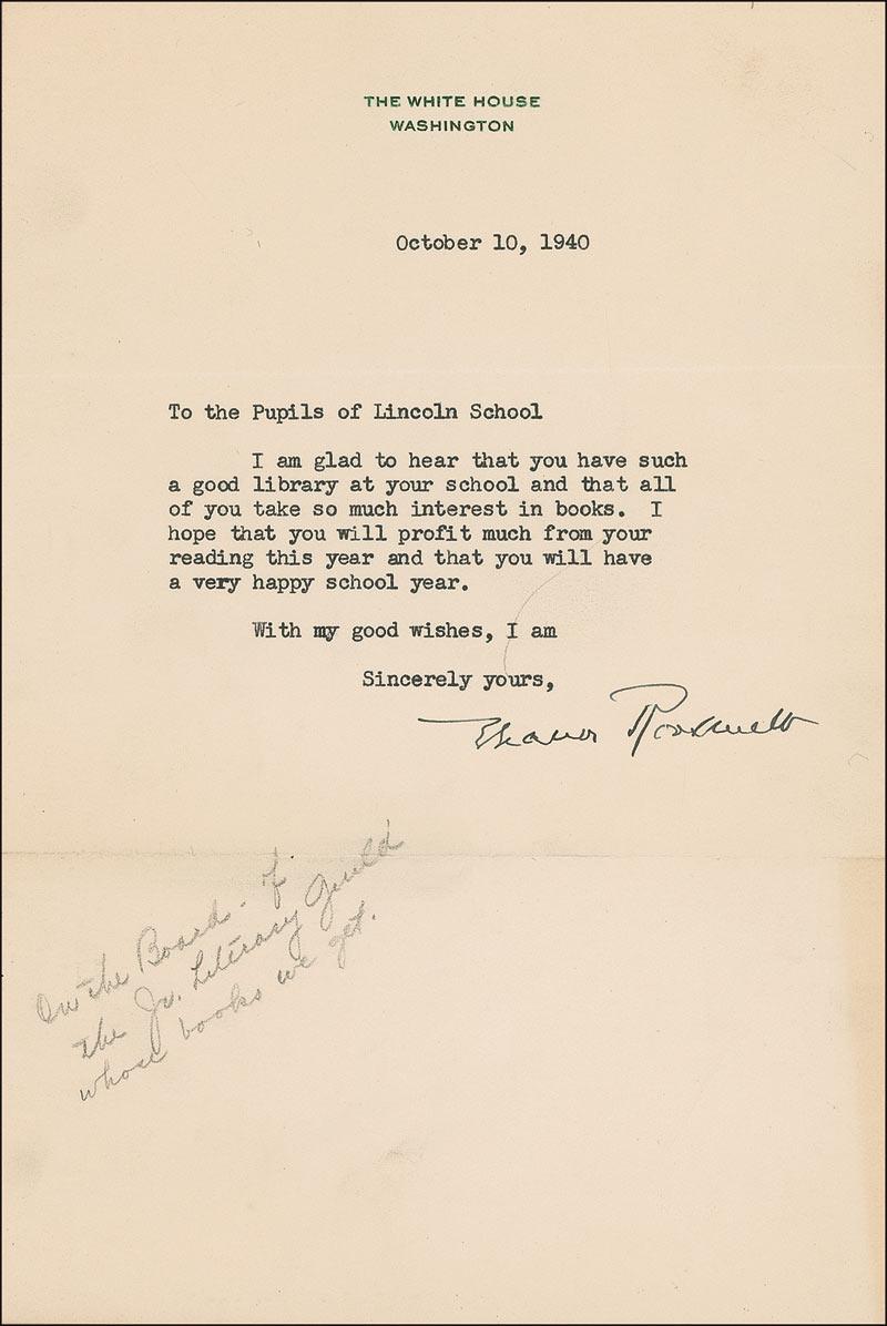 TLS, one page, 6.25 x 9.25, White House letterhead, October 10, 1940. Letter to the pupils of Lincoln School. In full: “I am glad to hear that you have such a good library at your school and that all of you take so much interest in books. I hope that you will profit much from your reading this year and that you will have a very happy school year.” Scattered mild toning, and a pencil notation to lower left, otherwise fine condition. RRAuction COA.