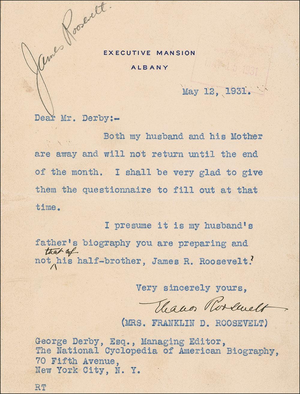TLS, one page, 5.75 x 7.5, Executive Mansion letterhead, May 12, 1931. The future First Lady replies to the editor of the National Cyclopedia of American Biography. In full: “Both my husband and his Mother are away and will not return until the end of the month. I shall be very glad to give them the questionnaire to fill out at that time. I presume it is my husband’s father’s biography you are preparing and not that of his half-brother, James R. Roosevelt?” A few light creases, soiling, and toning, a stamping at the top right corner, and a notation in pencil at the top left corner, otherwise fine condition.