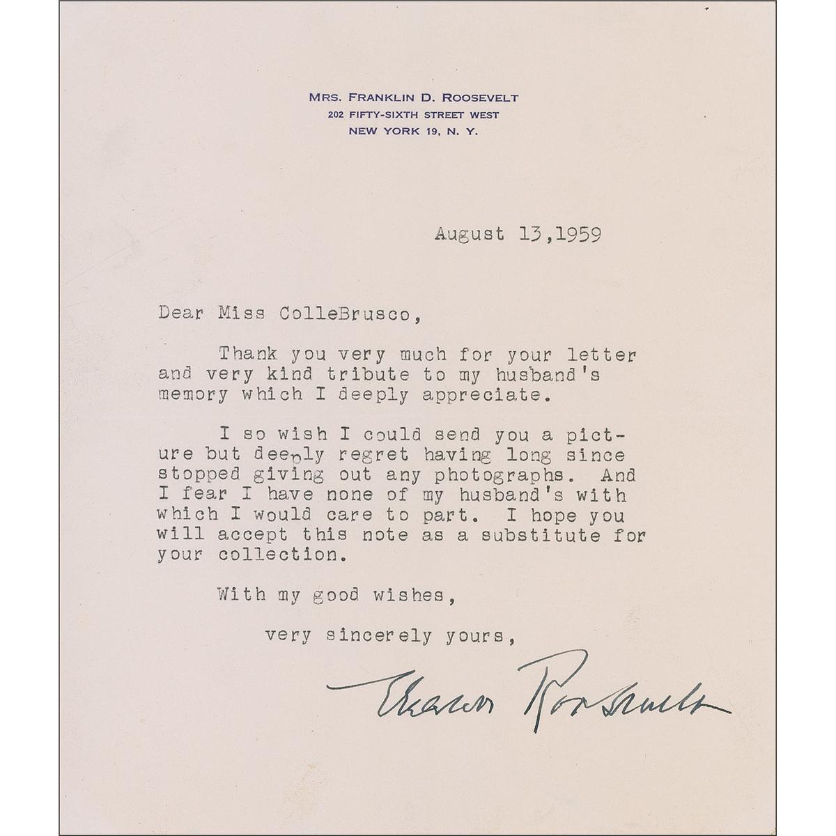 TLS, one page, 6 x 7, personal letterhead, August 13, 1959. Letter declining a request for a signed photo. In part: “I so wish I could send you a picture but deeply regret having long since stopped giving out any photographs. And I fear I have none of my husband’s with which I would care to part. I hope you will accept this note as a substitute for your collection.” In fine condition. Accompanied by the original mailing envelope.