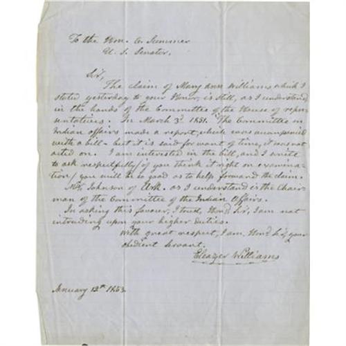 <B>Eleazer Williams Autograph Letter Signed</B></I> one page, 8" x 10", [n.p.], January 12, 1853, to Senator Charles Sumner (misspelled Summer) regarding a claim made by Mary Ann Williams. In part: "<I>The claim of Mary Ann Williams which I stated yesterday to your Honor, is still, as I understand, in the hands of the Committe Committeeouse of representatives. In March 3d, 1851, The Committee on Indian affairs made a report, which was accompanied with a bill, but it is said for want of time, it was not acted on. I am interested in the bill, and I write to ask respectfully (if you think it right on examination) you will be so good as to help forward the claim...</B></I>" Although research could not unearth information on the claim made by Mary Ann Williams, nor the bill referenced, inquiry into the circumstances of Eleazer Williams' life yielded many curious facts that only raise more questions about the content of this letter. Williams was born a Mohawk Indian, the son of Mary Ann. He was raised a Protestant and attended the missionary school that would become Dartmouth college. He spent most of his life ostensibly both as a missionary and a charlatan, at one time even renouncing his natural mother and claiming to be the son of Louis XVI and Marie Antoinette. This letter was written after his public denunciation of his birth mother in the form of documentation stating that she had adopted him. Ironically, Williams would spend that last years of his life as a roving missionary among the Indians also receiving donations from the European aristocracy, some of whom were convinced of his being the rightful heir to the throne of France. A fun piece of Americana documenting the conflicted mind of an Anglicized Indian, and worthy of further research! Usual mail folds, with a few creases; clean paper and bold ink.<BR><BR><b>Shipping:</b> Flat Material, Small (<a target="_blank" href="http://www.heritageauctions.com/common/shipping.php">view shipping information</a>)