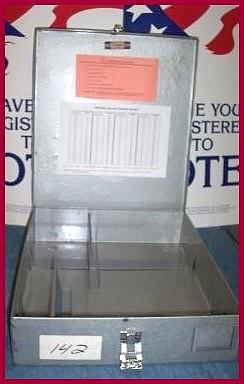 Steel Ballot Transfer Case used in the 2000 Presidential election. Box includes six step ballot handling procedure and unused ballot count chart. Each case was sealed with a wire that was placed through the cover latch before transfer. Another label on top of the case dictates the sealing procedure in red letters to prevent vote tampering. Each case also has a unique three digit serial number. Amazing piece of election history.