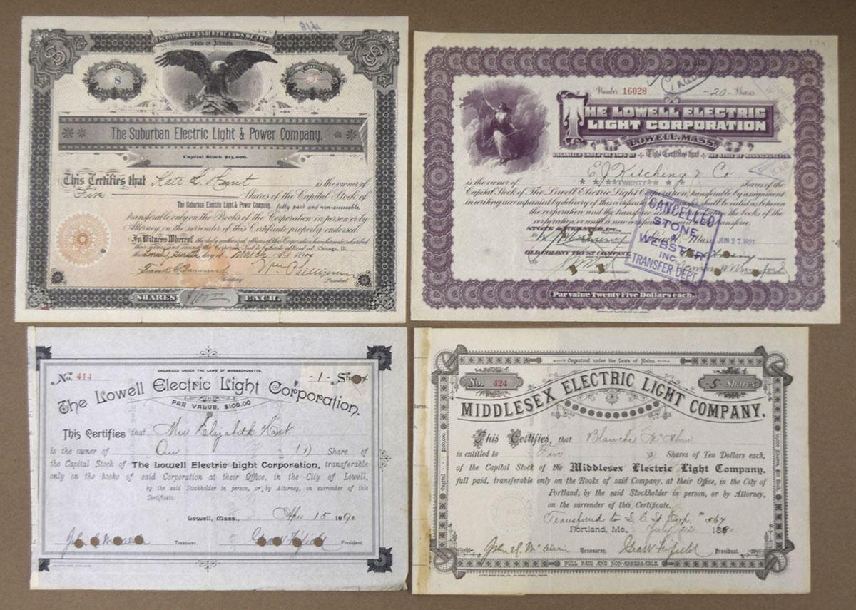 Various States, 1890-1927. Lot of 4 Stock Certificates, Includes: 1890, Middlesex Electric Light Co., I/U Cert; 1890, Lowell Electric Light Corp. I/C Cert; 1897, Suburban Electric Light & Power Co., I/U Cert; 1927, Lowell Electric Light Corp., I/C Cert. (4). Sold "AS IS" no returns accepted.