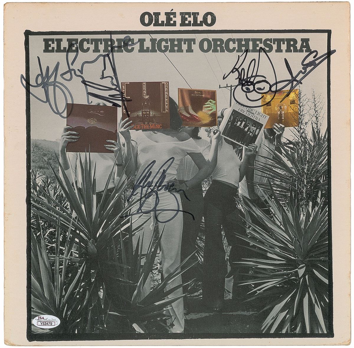 Ole Elo album signed on the front cover in black felt tip by Jeff Lynne, Bev Bevan, Mik Kaminski, Louis Clark, and Kelly Groucutt, who adds a smiley face. In fine condition. The record is not included. Accompanied by a full letter of authenticity from JSA.