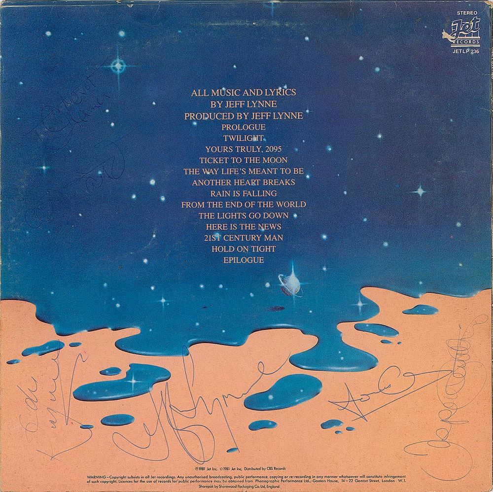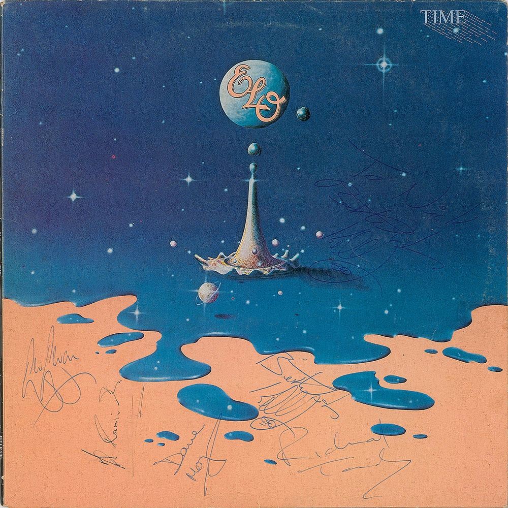 Time album signed and inscribed on the front cover in blue ballpoint, “To Nick, Best wishes, Kelly,” adding a smiley face and another signature below, “Bev Bevan,” “Richard Tandy,” “Dave Morgan,” and in black ink, “Mik Kaminski”; the reverse is signed in blue ballpoint, “Jeff Lynne,” “Louis Clark,” “Jasper Carrott,” “Trevor Francis,” and two others. In very good condition, with scattered creasing and surface scuffing and some signature contrast to dark portions of the background. The record is not included. Pre-certified REAL.