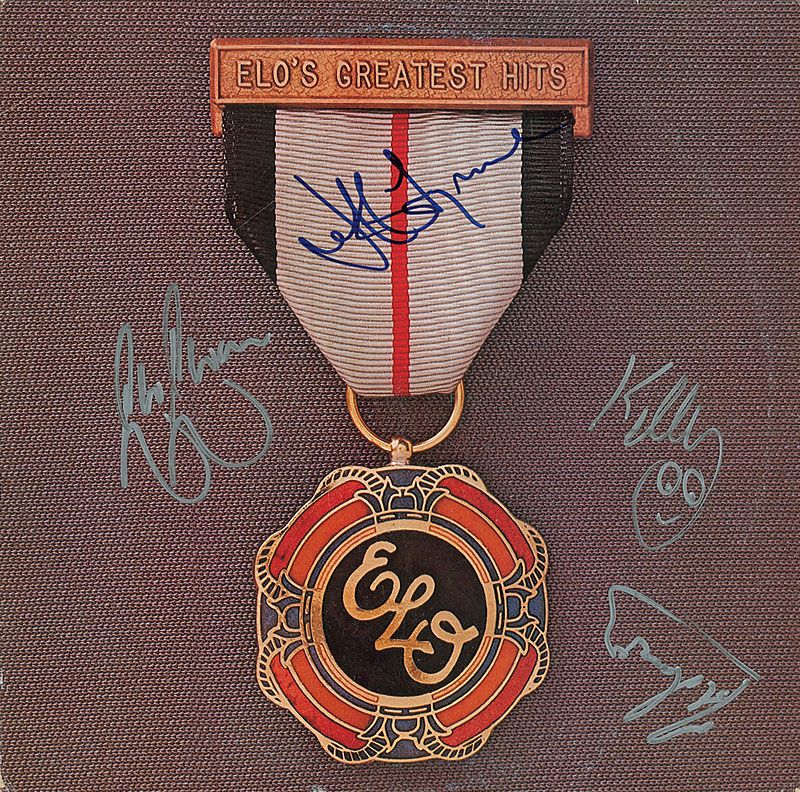 Greatest Hits album signed on the front cover in blue felt tip by Jeff Lynne and silver ink by Bev Bevan, Kelly Groucutt, and Mik Kaminski. In fine condition, with a few edge dings. The record is not included. Accompanied by a full letter of authenticity from Roger Epperson/REAL.