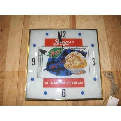 We have for sale a great Breyer Ice Cream Advertising clock. The clock has a glass front trimed in gold metal that has tarnished some. It lights up and it does work. The color is bright and vivid. I estimate it dates to the 60's although I do not know the exact age or date. This is a great advertising collector item. It weighs 10 pounds and measures 3 x 15.25 x 15.25. We do have more photographs that we can email if you are interested. And if you have any questions please contact us by email or telephone before you purchase the item. Please view our Terms of Sale and Shipping policy. We only ship to the continental U.S. We do have a retail store and there are times the item may be sold through our store. We try to remove items immediately or the next day at the latest. Mixup's are bound to occur and if this happens we apologize for the confusion