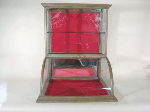 "Electric" straight razors/strops display case. Curved glass/German silver and glass/original etched glass 21.5" x 29" x 21" good cond. Rare.