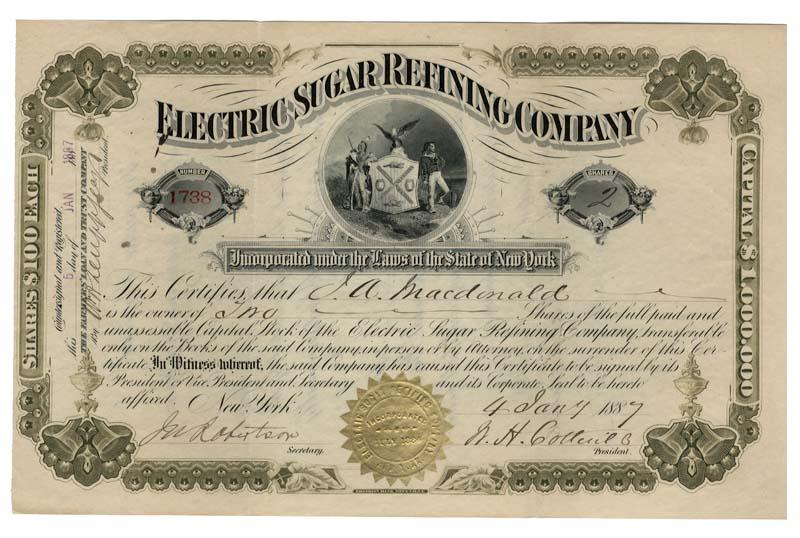 1887, New York. Stock certificate for 2 shares. Green ornate border. Detailed vignette at top center. Uncancelled and excellent.
