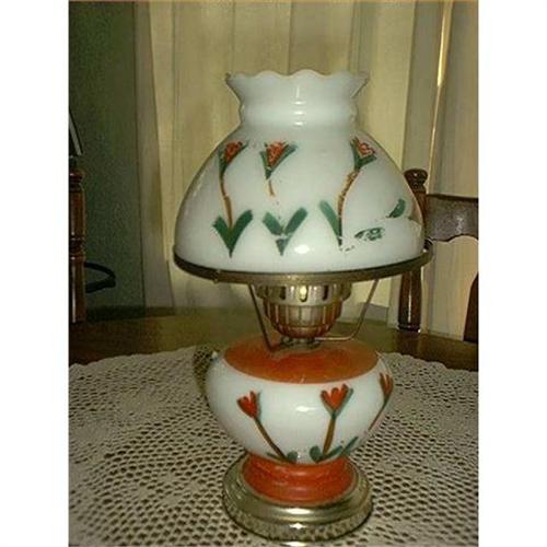Lamp electric white with orange flower, some of the green leaf is faded. The lamp is otherwise in good condition.