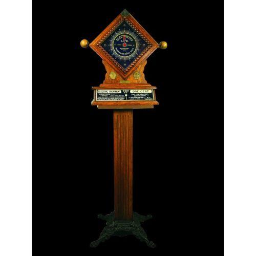 Electric Treatment. Electricity is Life coin operated, one cent. Midland Mfg. Co. Chicago, IL. Dated 1900. Oak cabinet, mounted on period type pedestal with cast iron base. Comes with keys in excellent working condition. 58 inches tall.