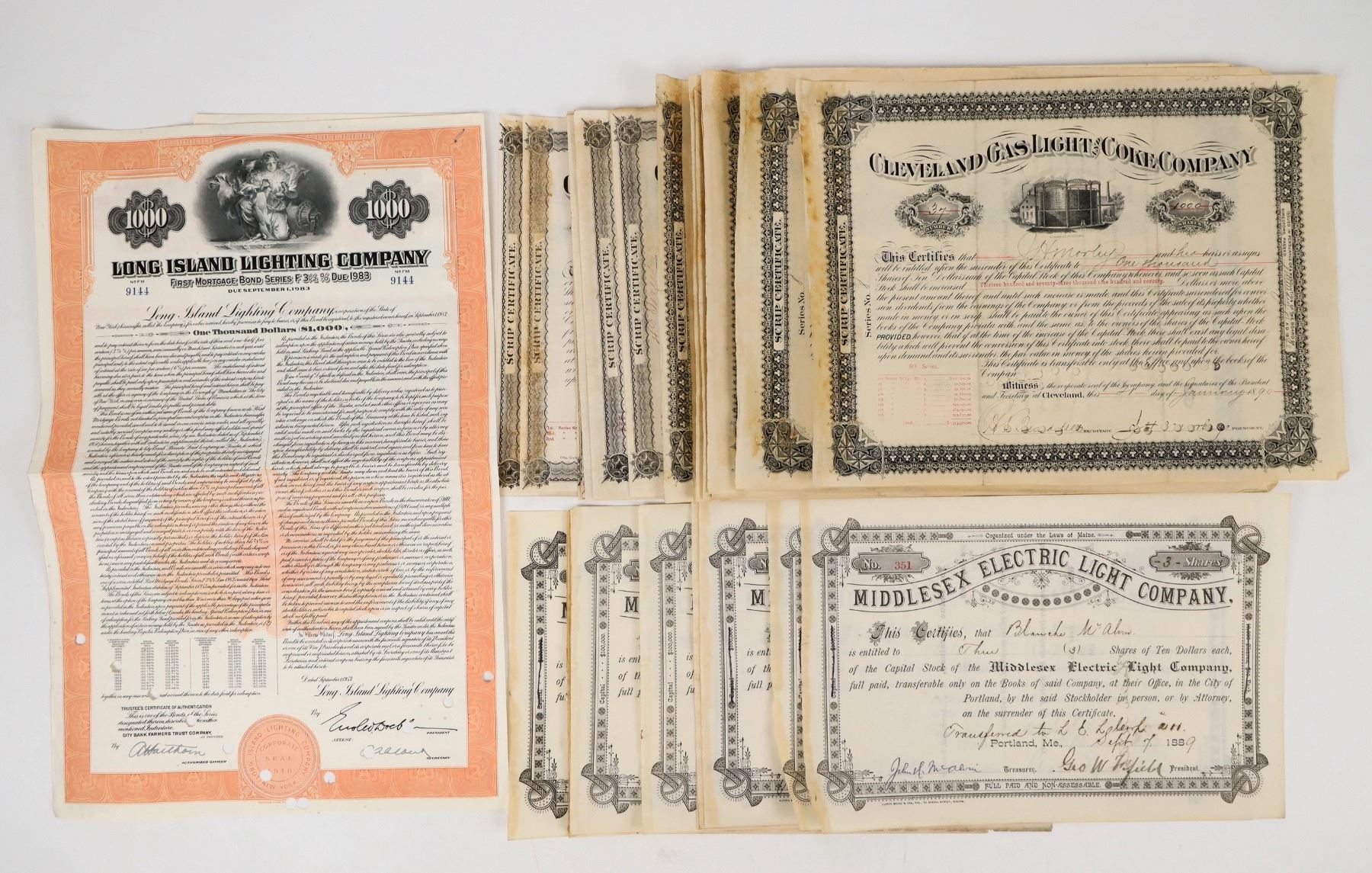 Electric and Gas like Company Stocks includes Middlesex Electric Light 1880s, Cleveland Gas Light 1870s-90s two varieties, Long Island Lighting c1950s. About 35 total.
