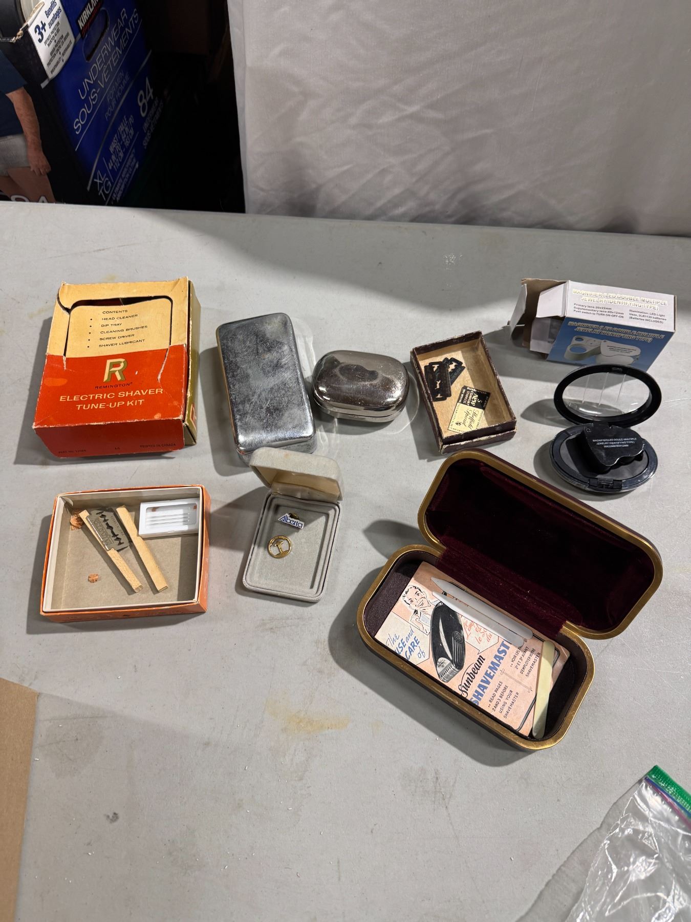 Electric shaver, tuneup kit, travel cases, razor blades, and magnifier
