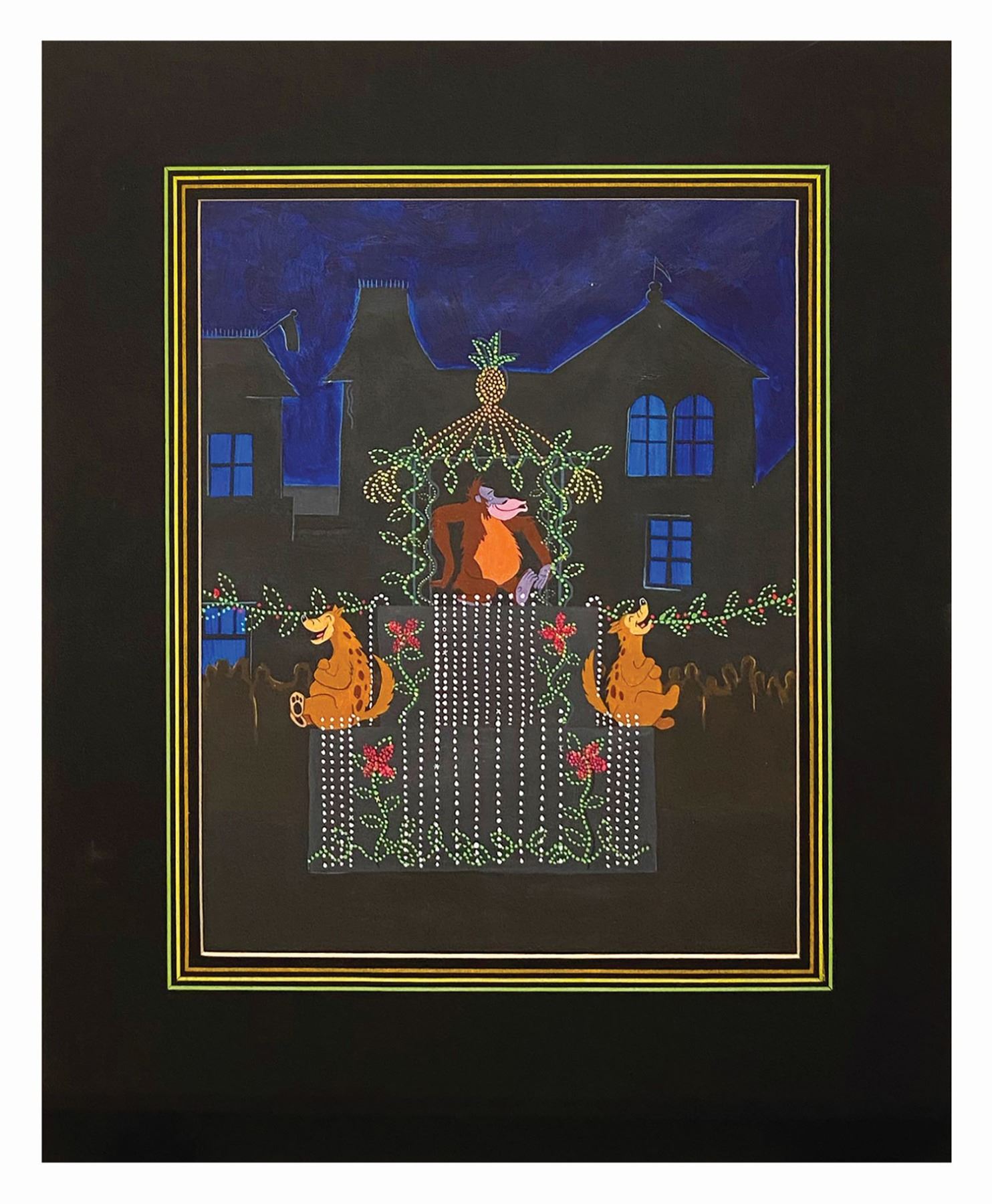 (Disneyland, 1977) A gorgeous concept painting for a Jungle Book float for the Main Street Electrical Parade. This float design features King Louie and two hyenas. To better illustrate the usage of lights within the float, a cel layer has been added with painted dots used to indicate the placement of lights. The cel is placed over a hand-painted background with the character elements cut and applied to the background. Measuring approximately 16.25"x12.75" in the 21"x17" mat, the concept is in very good condition with minimal surface wear to the paint of the cel.