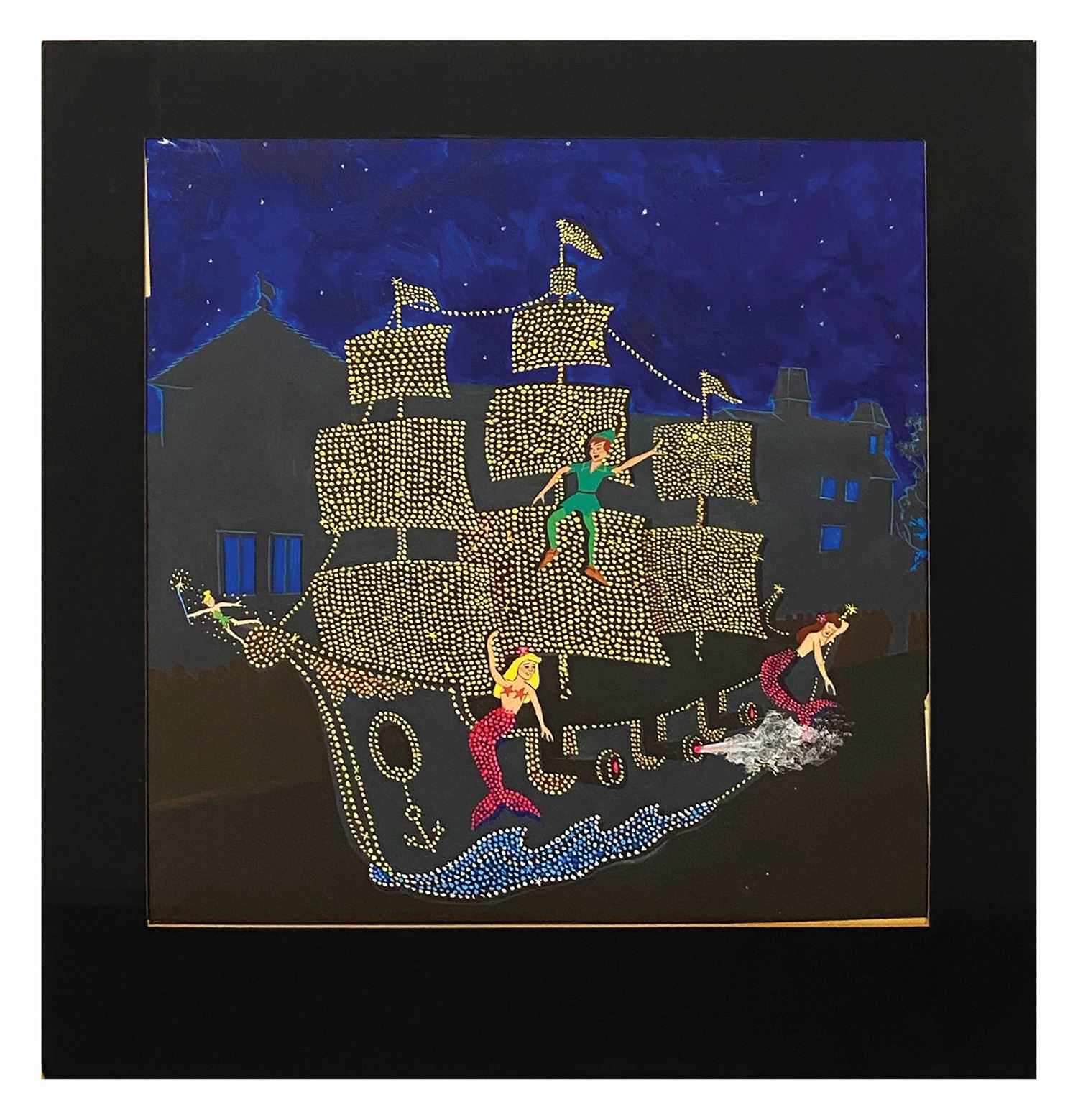 (Disneyland, 1977) A beautiful concept painting for the Peter Pan float in the Main Street Electrical Parade. This float design features Peter Pan, Tinker Bell, and two mermaids on the Jolly Roger. To better illustrate the usage of lights within the float, a cel layer has been added with painted dots used to indicate the placement of lights. The cel is placed over a hand-painted background with the character elements cut and applied to the background. Measuring approximately 13.5"x12.25" in the 18"x16.75" mat, the concept is in good condition with some light surface wear to the paint of the cel.