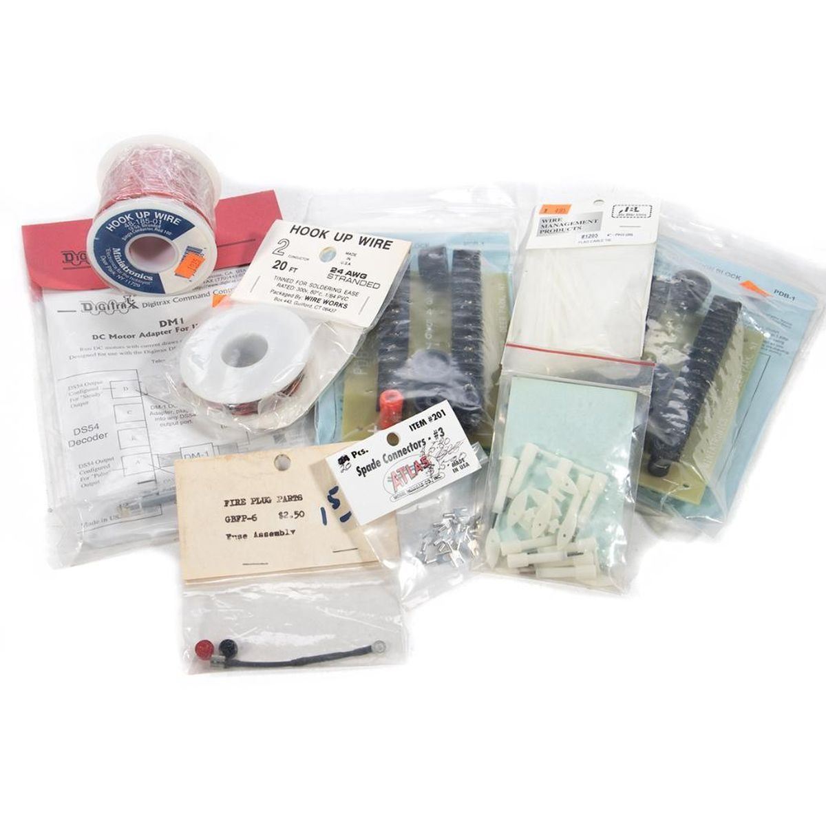 PDB-1; New Old Stock; Power Distribution Block PDB-1; New Old Stock; Power Distribution Block 48-185-01; New Old Stock; Hook Up Wire : 100™ Red, 18 Gauge Stranded New Old Stock; Hook Up Wire : 2 Conductor : 20™ : 24 AWG Stranded : Tinned DM1; New Old Stock; DC Motor Adapter for Use with DS54 1205; New Old Stock; 4 cable tie - quantity 20 201; New Old Stock; #3 Spade Connectors 20 pieces New Old Stock; Thumb Clamp - quantity 10 GBFP-6; New Old Stock; Fuse Assembly Used; Single Pole, double throw, Knife switch: rated 25 Amp, 125 V