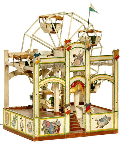 Electrically Driven Ferris Wheel, c. 1930 Model ferris wheel with 6 gondolas, wooden construction (20 1/2 x 15 3/4 x 27 in.), electric motor and lighting, decorated with glass pearls and pictures. - A very attractive showpiece!<Br>