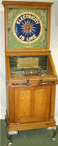 Electricity Is Life arcade game used in the early part of the century as panacea for your ills. This one is in great restored condition and works. The graphics and glass are in very nice condition. This is a top of the line arcade item for the advanced collector. Few ever offered for sale.