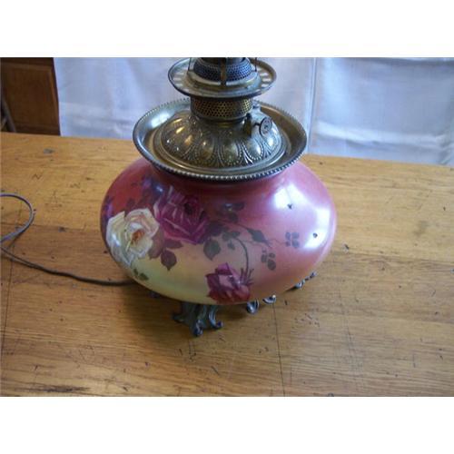 No top to this pretty lamp.Just the base but very pretty with the roses all around.A couple of rough spots(see picture).Measures 12" tall by approx. 10" across center.I think this can easily be converted back to an oil lamp.