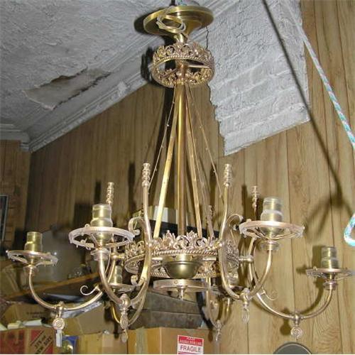 This antique gas light cast bronze chandelier was recently cleaned and wired for use. Accepts 40 watt bulbs. Measures approximately 30" wide and 24" high. Originally held approximately 12 dozen hanging crystals and the original wire loops remain in place. This item resides on the upper east side of Manhattan in New York city, and may be seen in person by appointment. Thanks for visiting. Please let us know if you have any questions or comments.