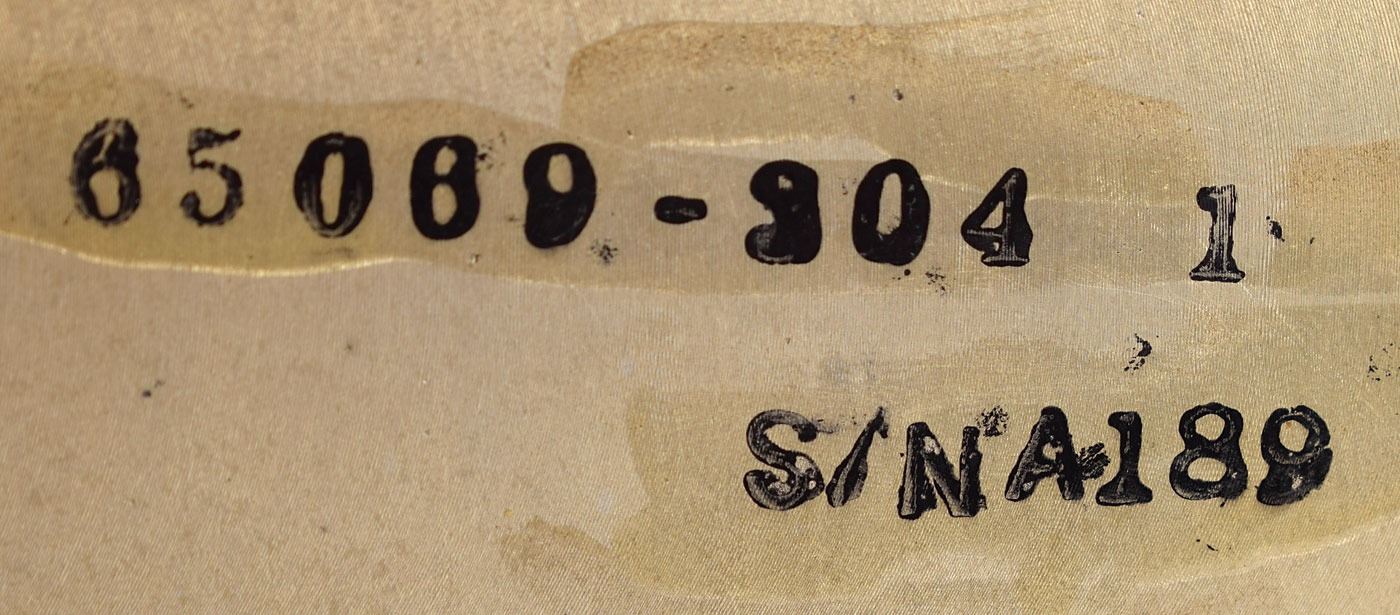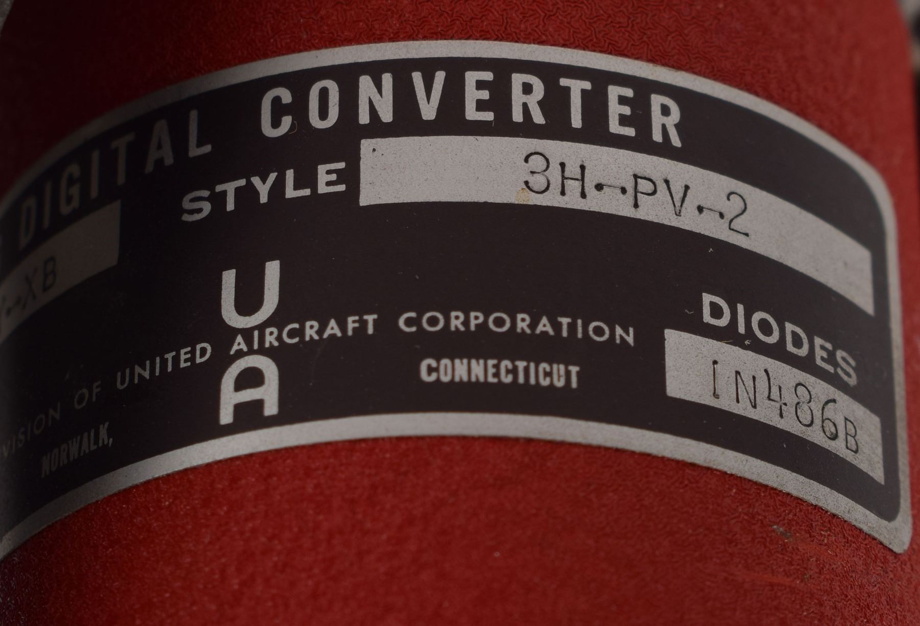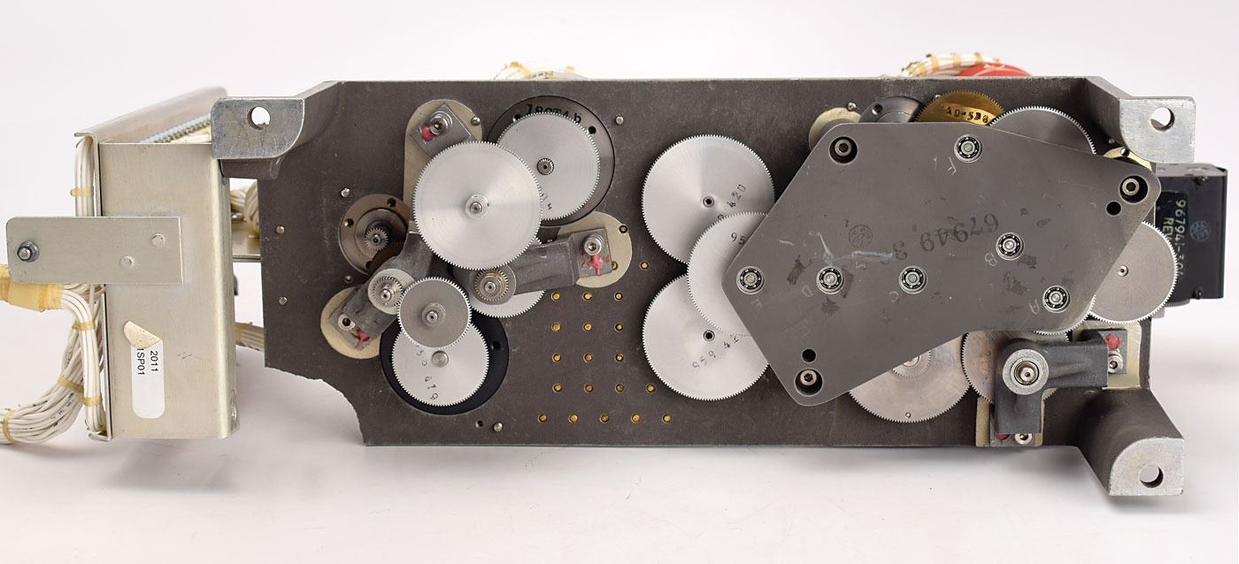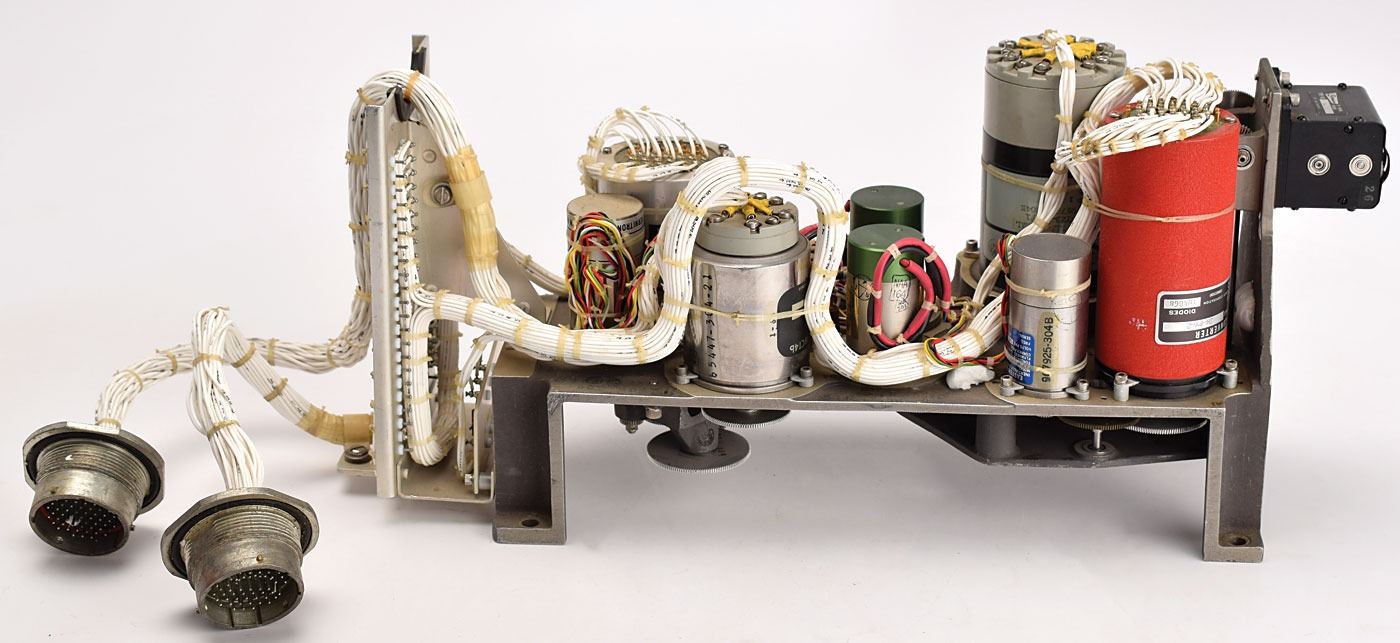 Interesting electromechanical computer module, measuring approximately 14˝ x 6.5˝ x 3.5˝, marked on one side of the metal chassis, "65069-304 1, S/N A189." A mechanical counter is affixed on one end, and the wiring terminates in two Bendix connectors marked "J1" and "J2" on the other end. Components mounted on the unit include a United Aircraft Digital Converter, a Vernitron Resolver, two Solvere Resolvers, and other parts. The underside features numerous interconnecting gears. In very good to fine condition.