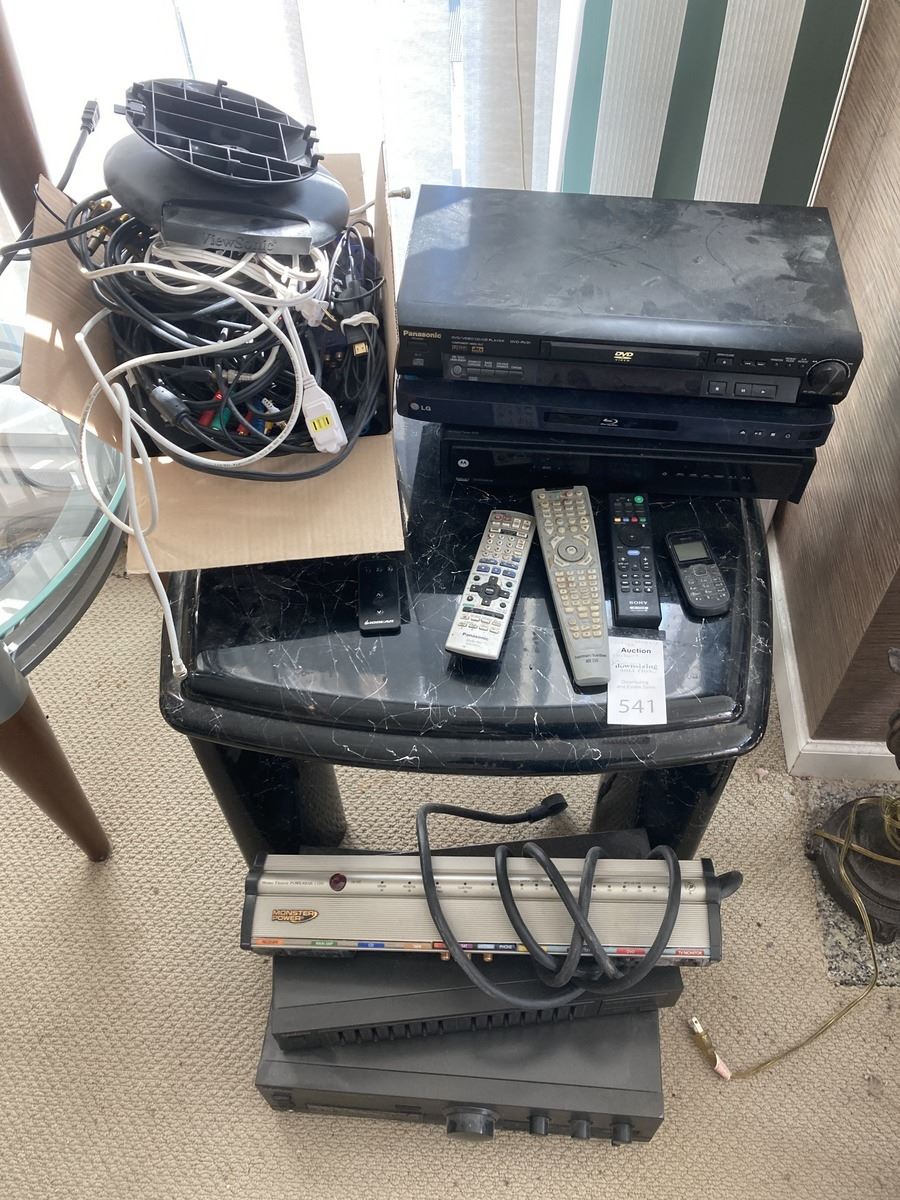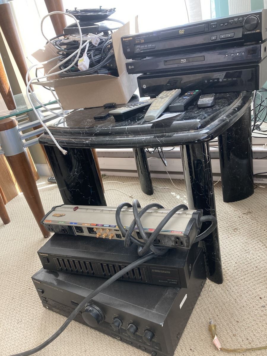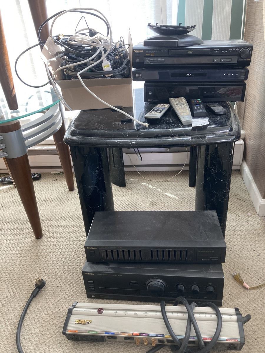 Electronics includes small end table, Panasonic DVD-RV31, LG blu-ray, Motorola DVR, Technics, various cables and wires, and more. All untested Bring boxes. Pickup 9-10am.