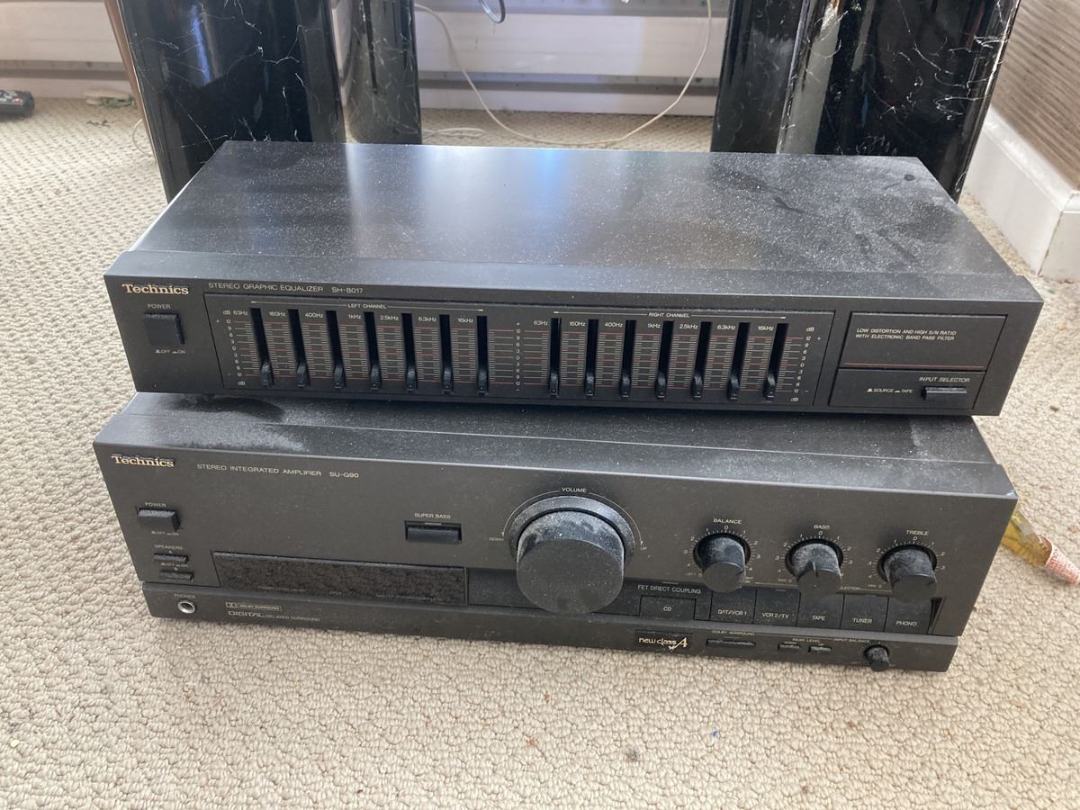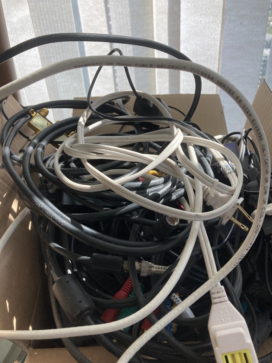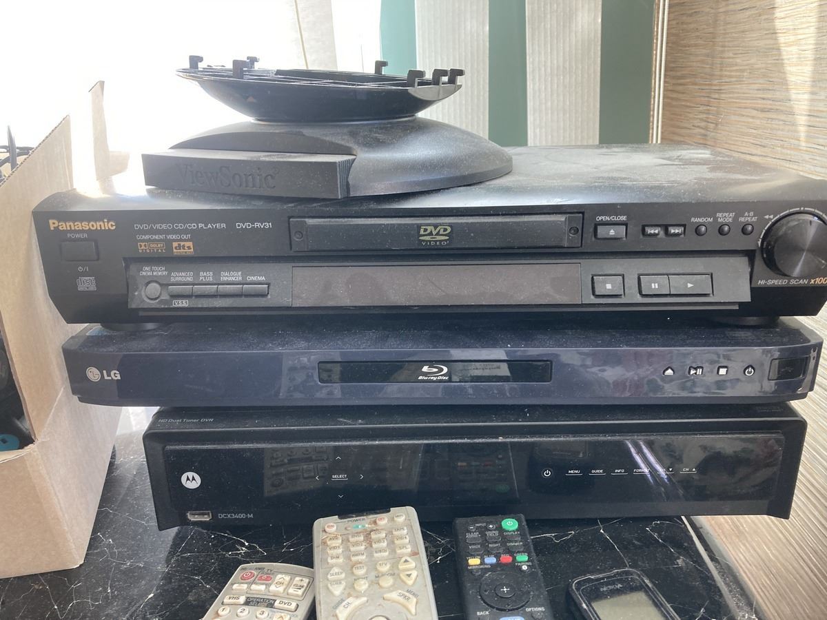 Electronics includes small end table, Panasonic DVD-RV31, LG blu-ray, Motorola DVR, Technics, various cables and wires, and more. All untested Bring boxes. Pickup 9-10am.
