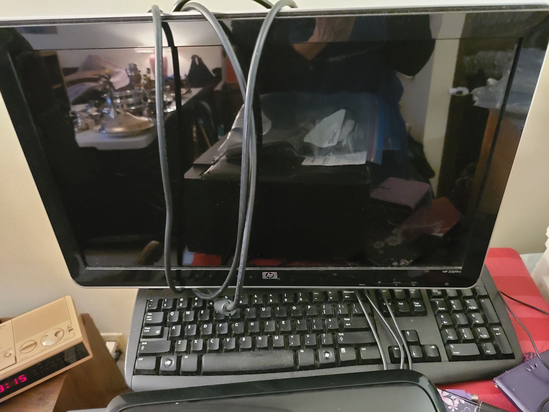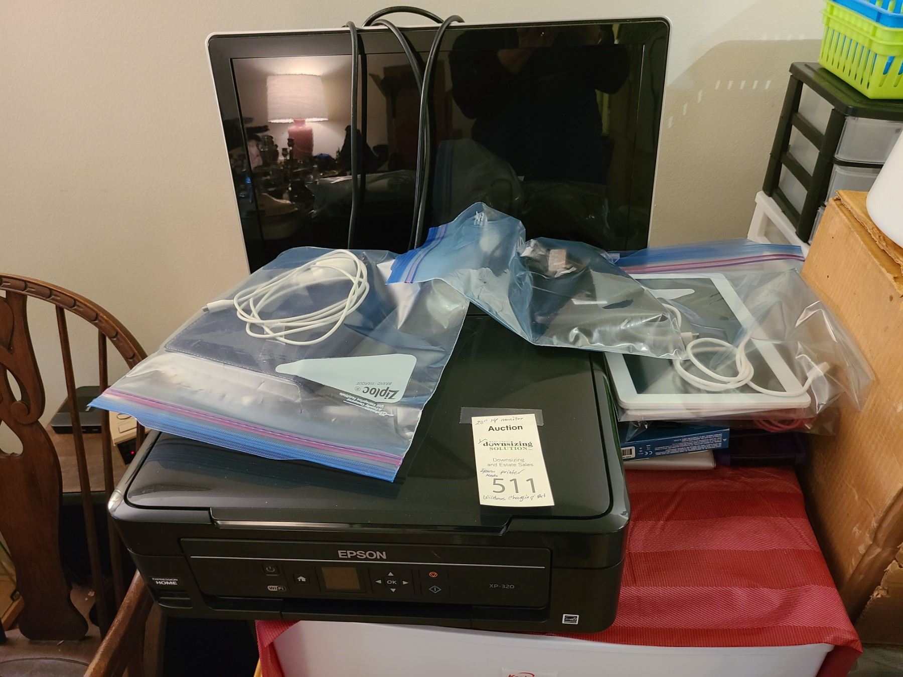 Epson XP-320 printer, needs maintenance, 20 in HP. Monitor, wireless 7 in. charging pad. Bell ZTE K81 Tablet with cord. & 2 Tablets with cords from Asia with cords, Kindle 6 in., keyboard, and cell phone cases. Pickup in cat. B at 10 am.
