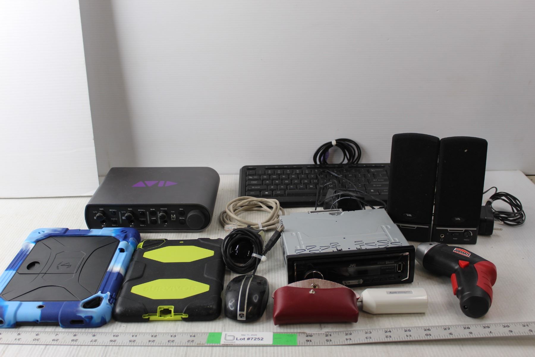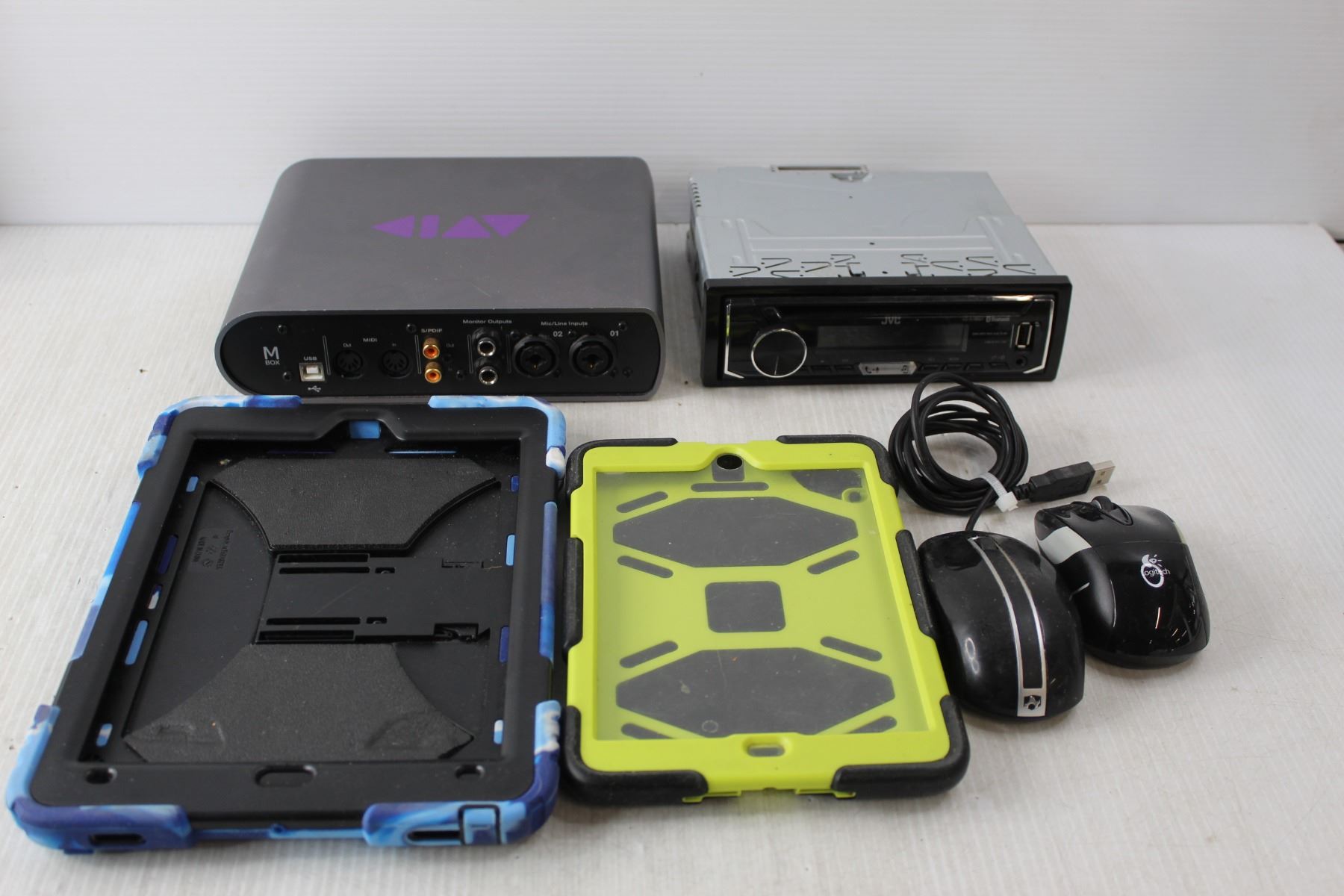 Electronics Lot- MBox Studio, JVC Car Stereo, (2) Tablet Cases, Misc.