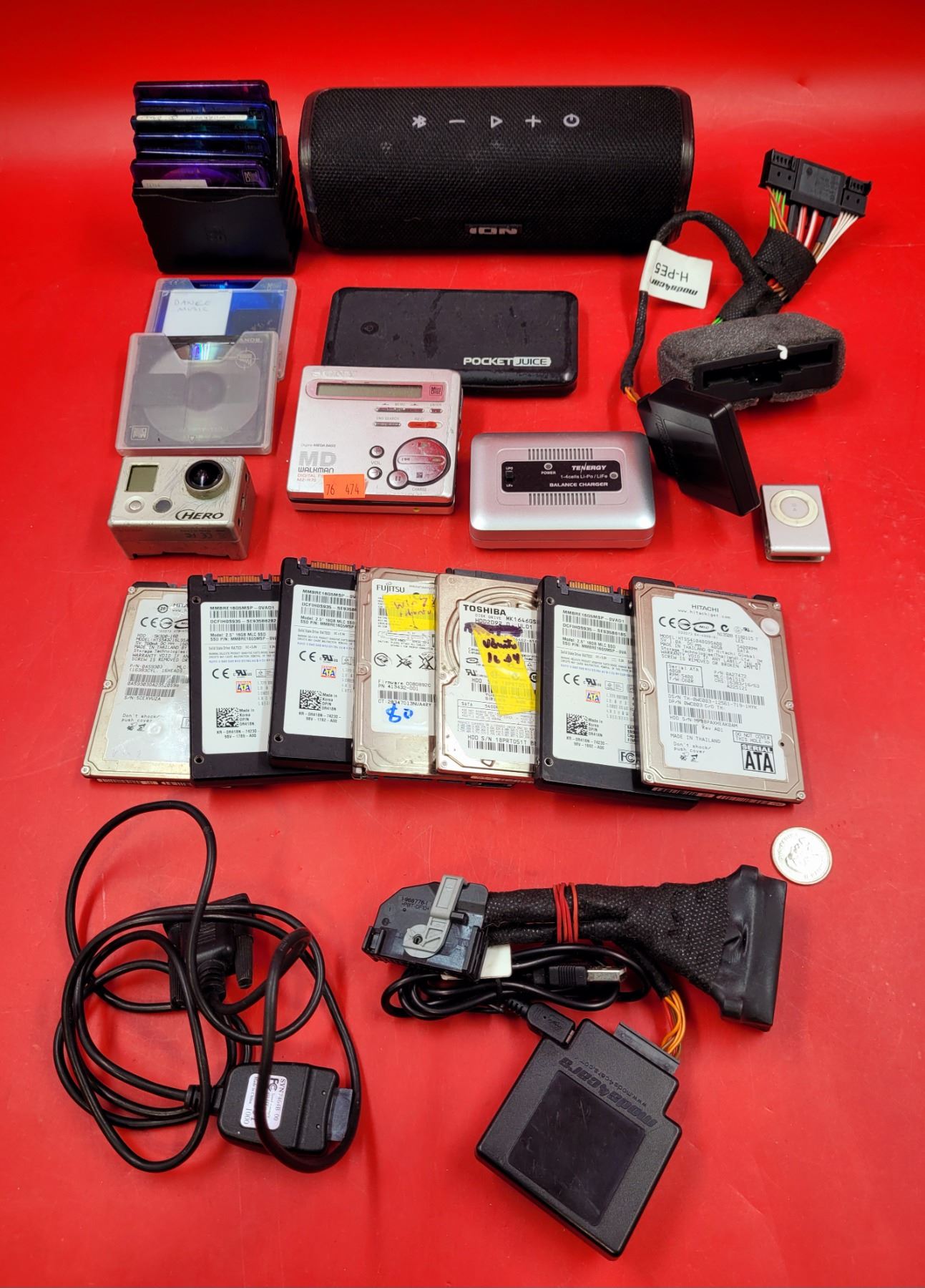 Electronics Lot w/ Hard Disk Drives, Portable Speaker, MD Walkman, & More