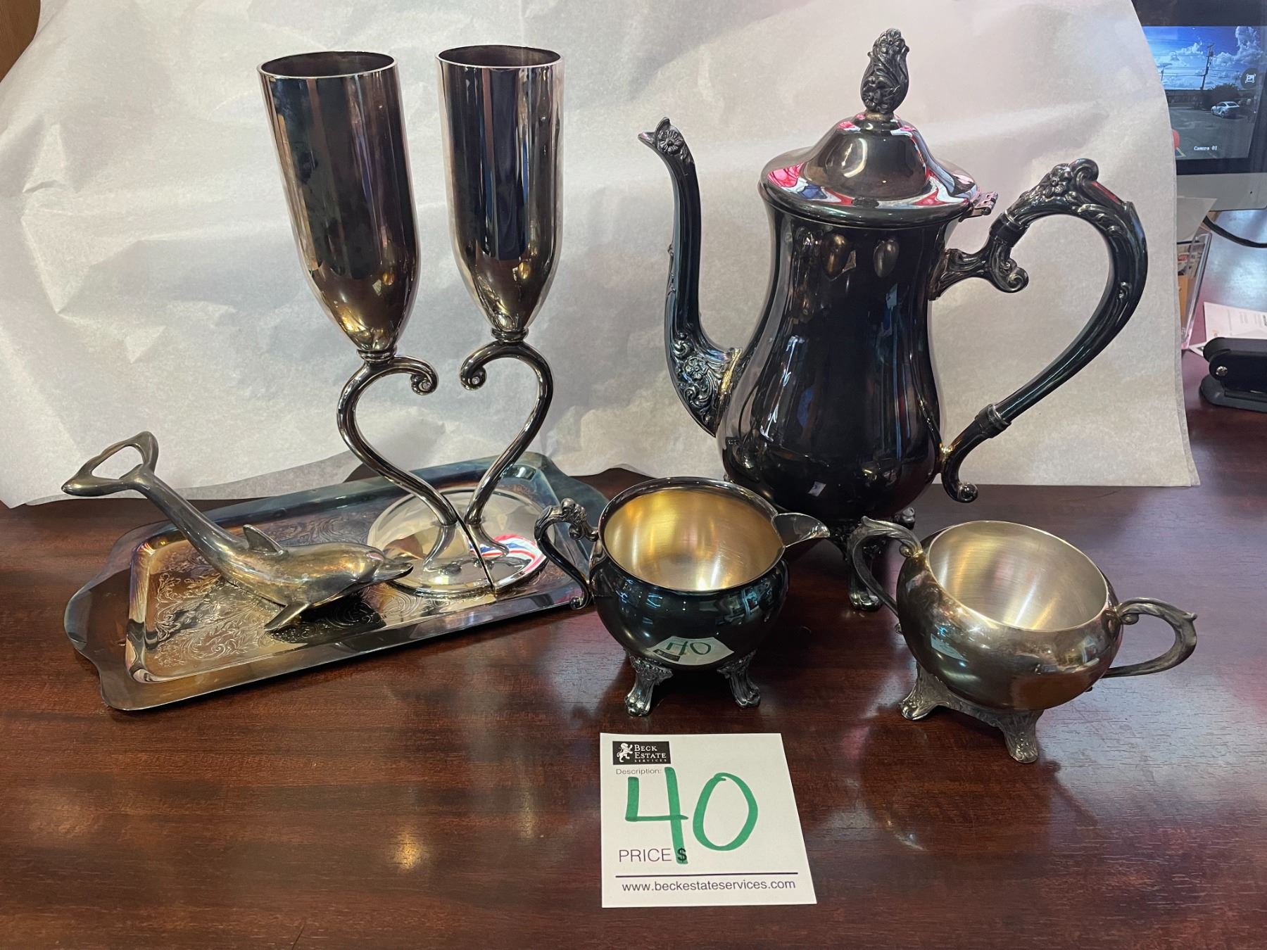 Suffolk Silversmiths Electroplated Tea set with Creamer, Sugarbowl, Small Tray, Champagne Flutes, and Dolphin Bottle Opener.