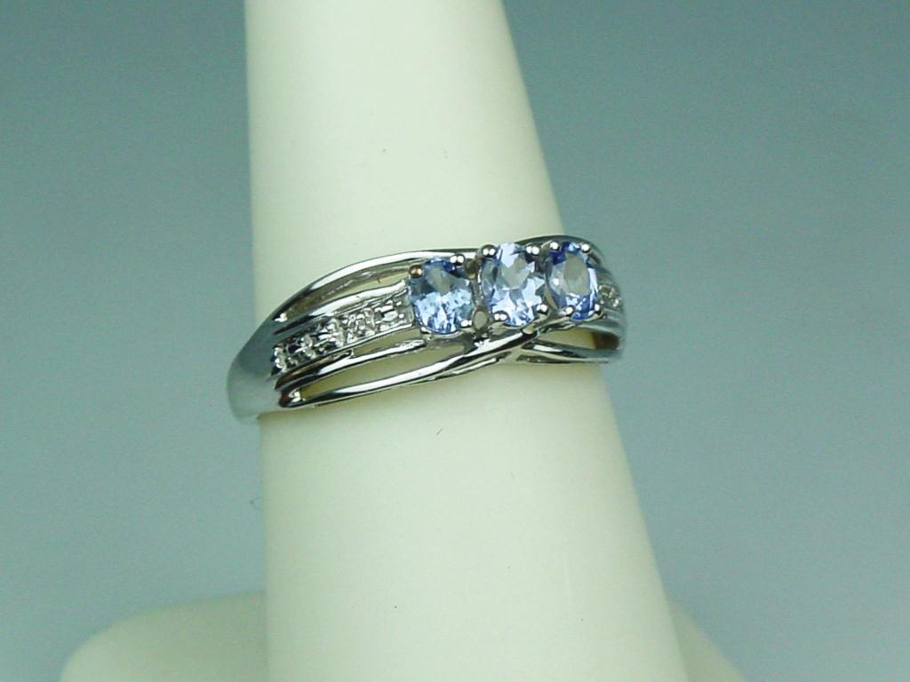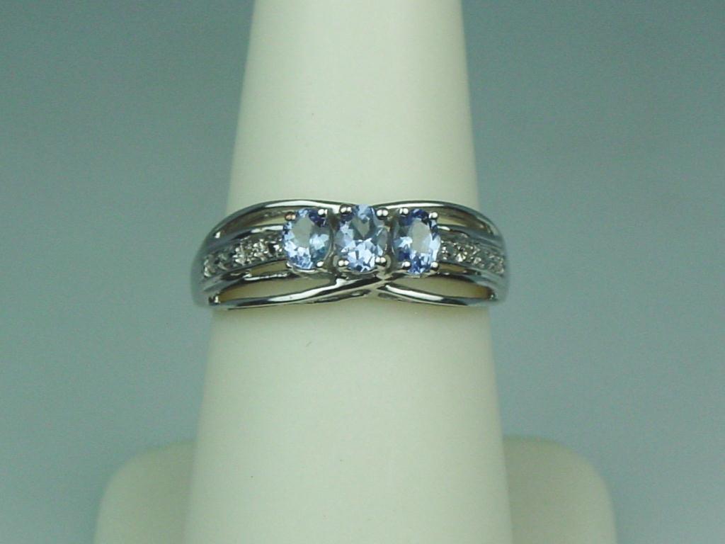 Elegant 10 White Gold Ladies Ring Set with 3 oval Tanzanites and side diamonds weighing approx. 0.60 carats.Set with 3 oval Tanzanites and side diamonds weighing approx. 0.60 carats.