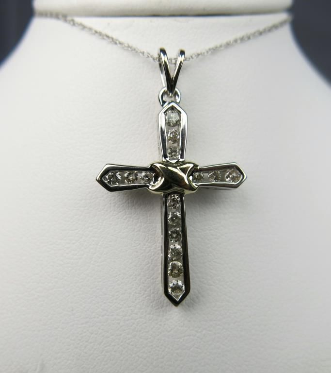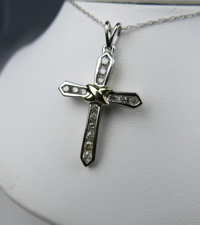 Elegant 10 karat two-tone gold ladies cross channel set with 15 round diamonds weighing approx. 0.30 carats. Estimate $300-$500
