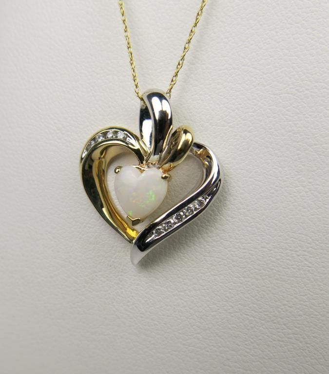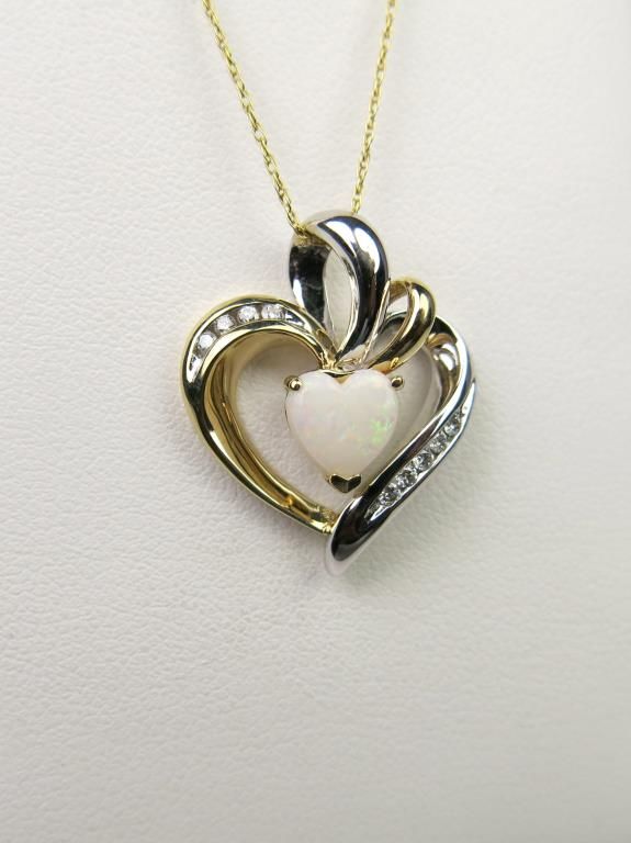 Elegant 10 karat two-tone gold ladies heart design necklace set with and opal and nine channel set diamonds. Estimate $400-$600 Nice