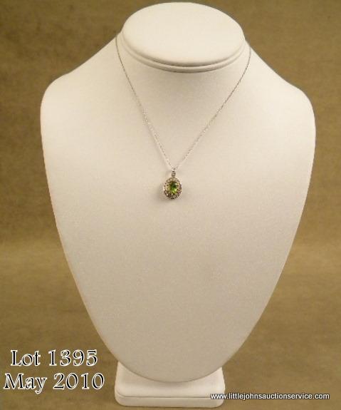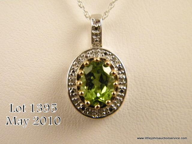 Elegant 10 karat two-tone gold ladies pendant set with a center green Peridot weighing over 1.50 carats and surrounded by 10 diamonds of G-H colors. Retail $995.00 Estimate $200-$400 A nice item
