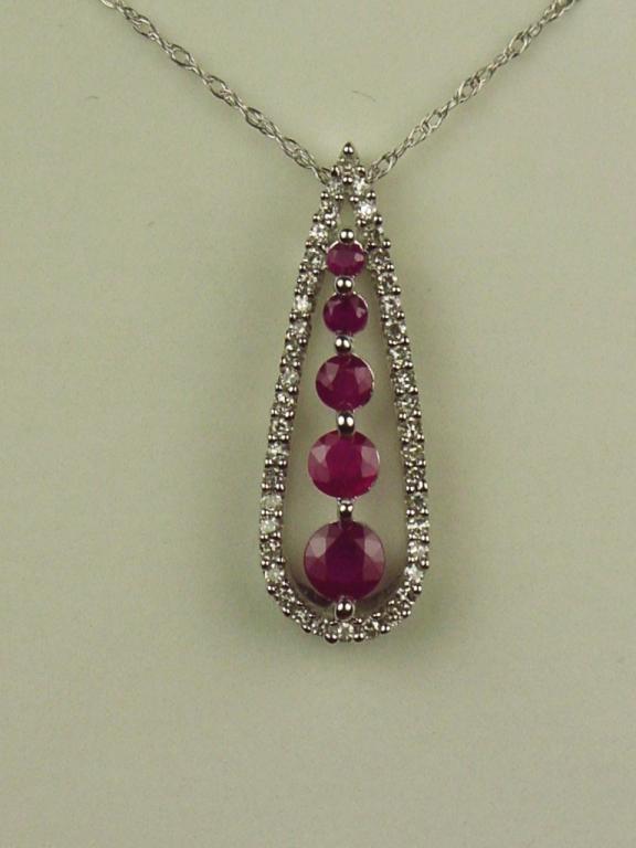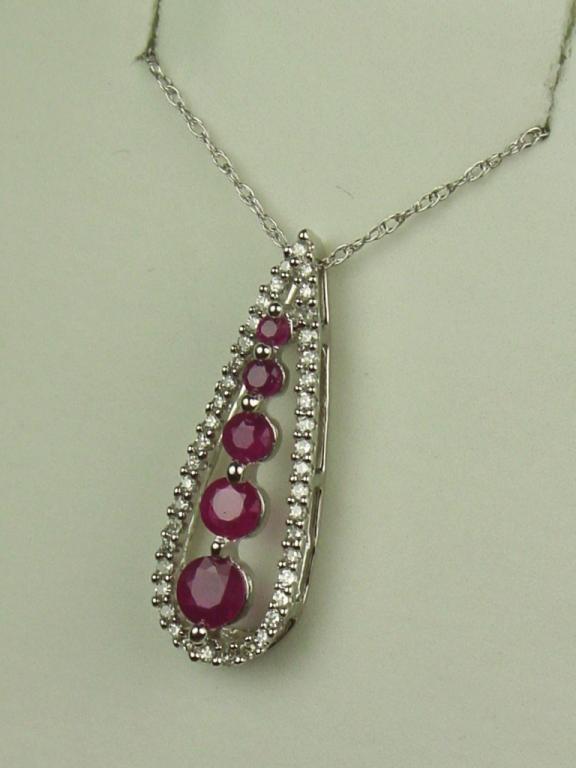 Elegant 10 karat white gold ladies pendant set with 5 red rubies and 42 round diamonds weighing approx. 1.00 carat. Retail $995.00 Estimate $300-$500