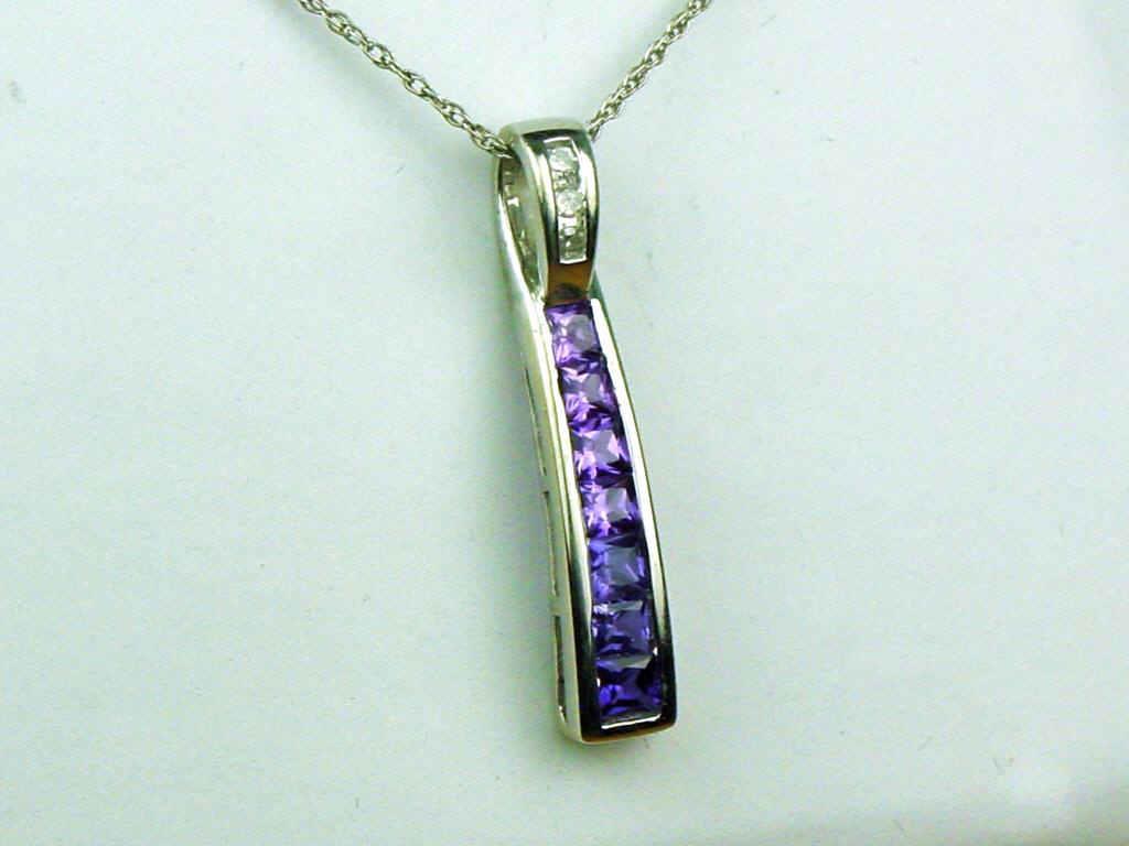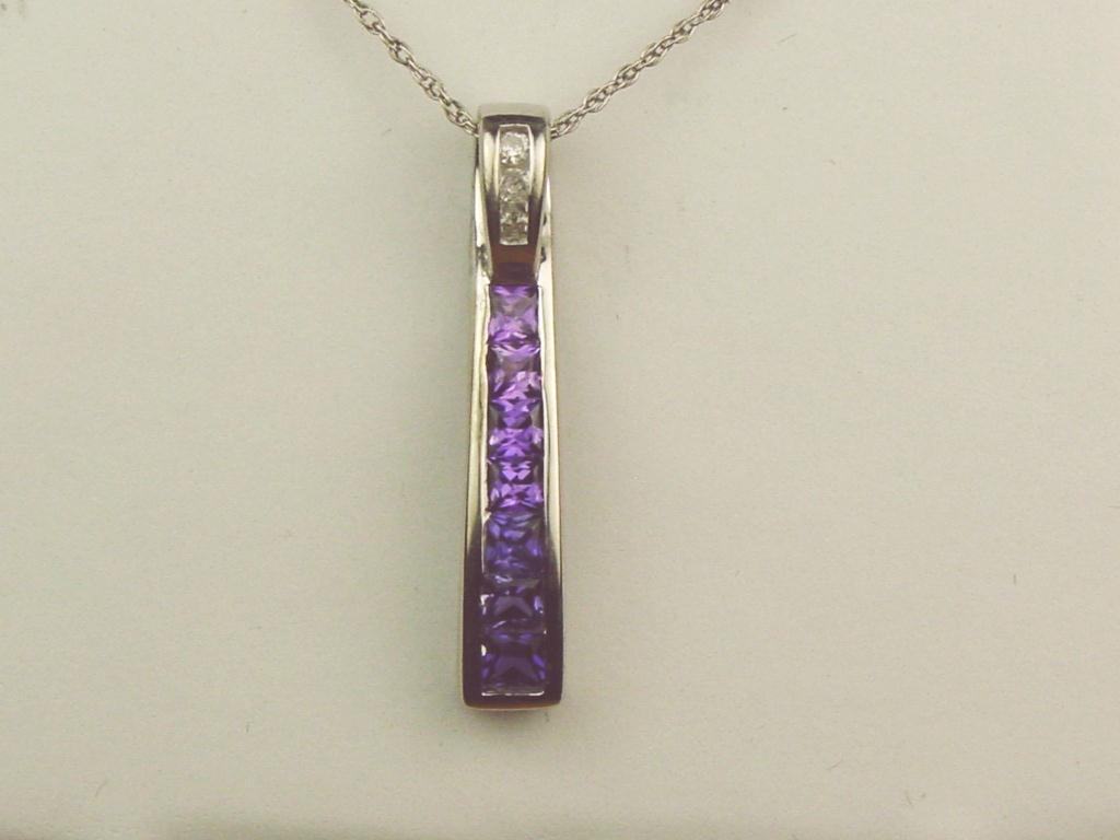 Elegant 10K WG Ladies Custom Made Pendant Channel set with 7 princess cut Amethyst and side diamonds weighing approx. 2.00 carats. Retail: $995.00Channel set with 7 princess cut Amethyst and side diamonds weighing approx. 2.00 carats. Retail: $995.00